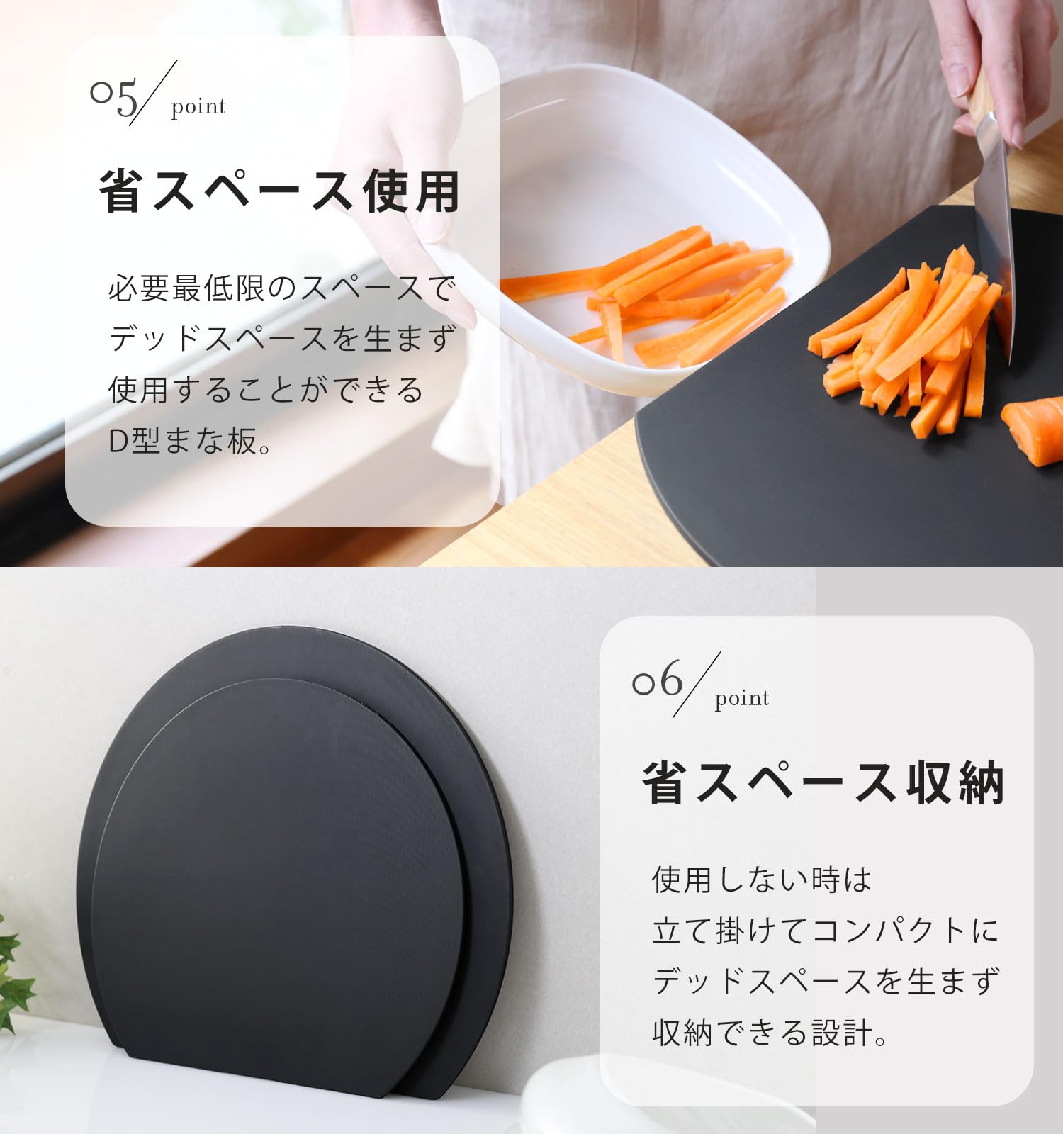 ?【丸いD型まな板】最小限のスペースでデッドスペースを生まずに使用できるD型のまな板。丸い形の下をカットした形で使用しない時は立て掛けて収納可能な設計。