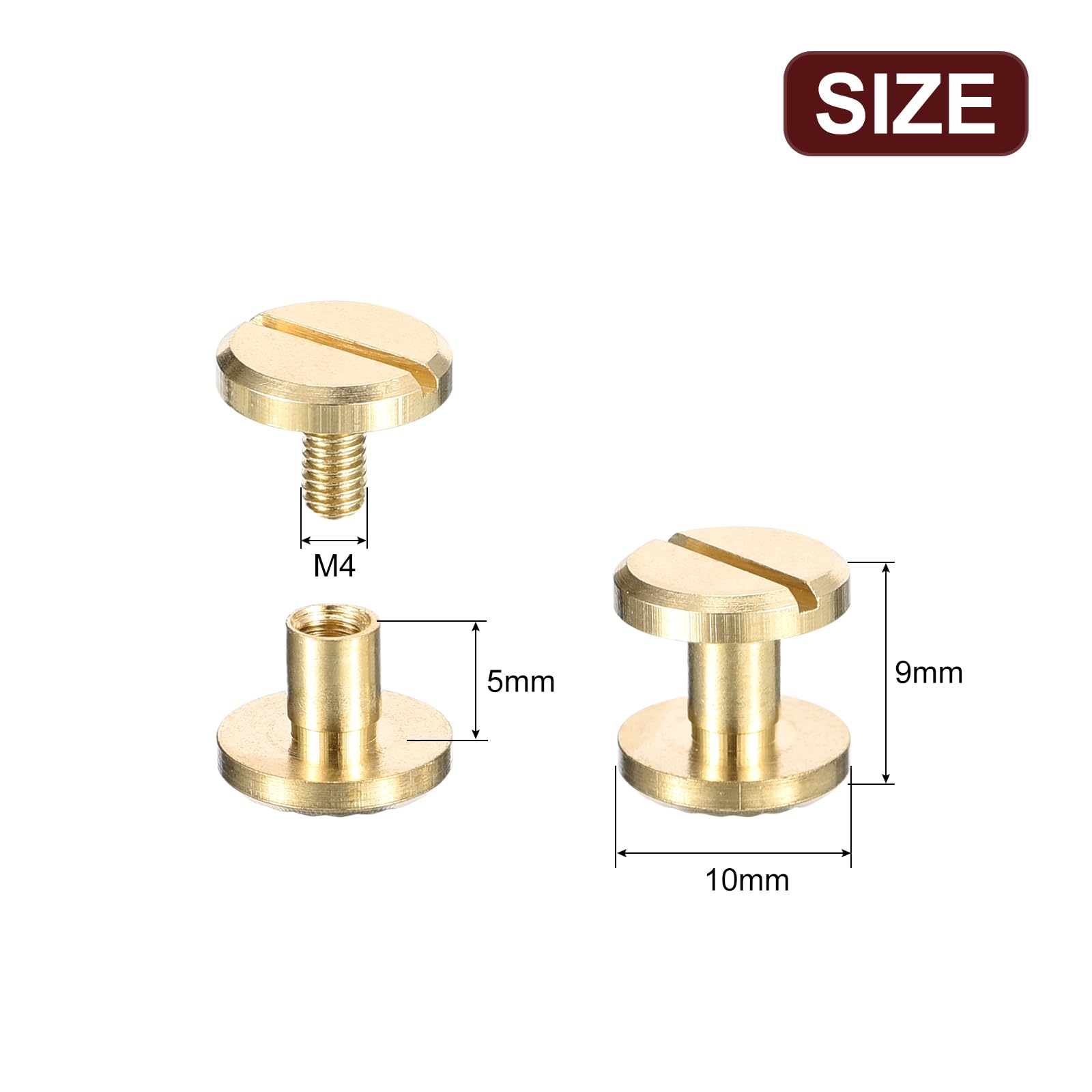 [シカゴスクリューリベット] - ねじタイプ:スロット、形状:フラットラウンドヘッド、ベース直径:10mm/0.39、ねじサイズ:M4(4mm/0.16)、ポストロッドの長さ:5mm/0.2、総高さ:9mm/0.35、パッケージ:10セットのシカゴスクリューリベット
