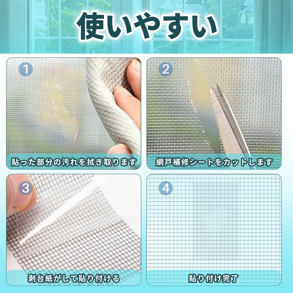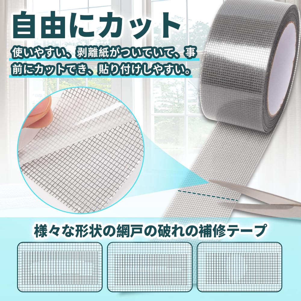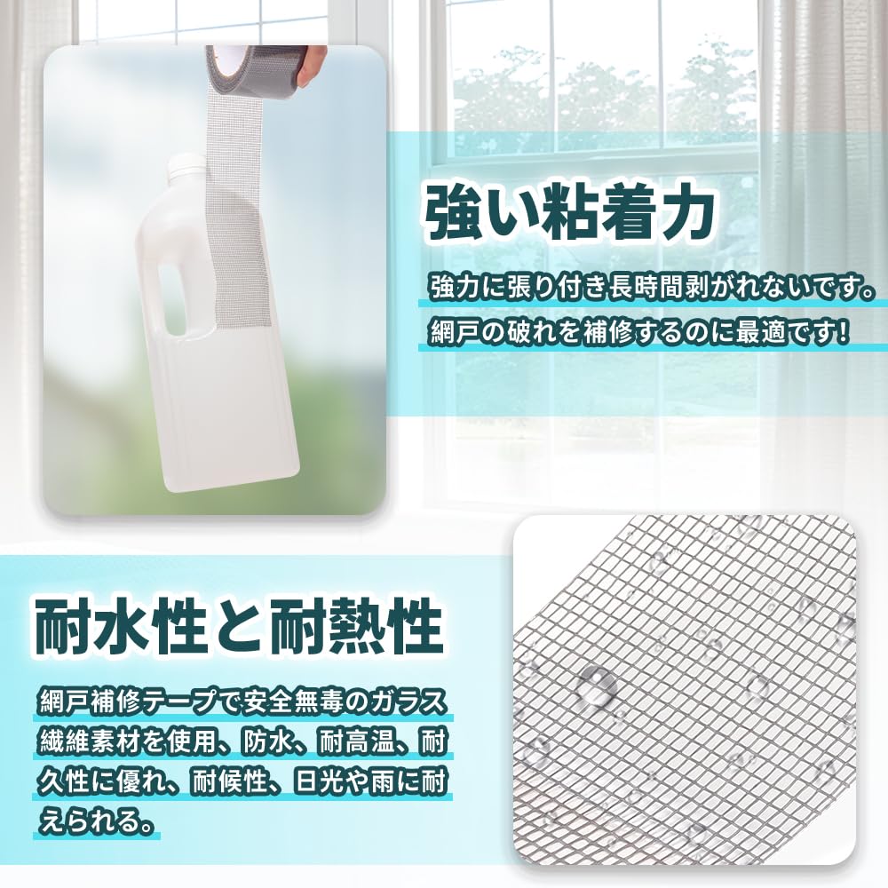 強い粘着力、耐久性:強力に張り付き長時間剥がれないです。網戸の破れを補修するのに最適です!強力のガラス繊維素材を使用、防水、耐高温、耐久性に優れ、耐候性、日光や雨に耐えられる。