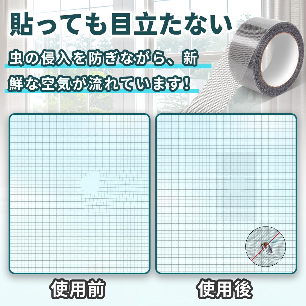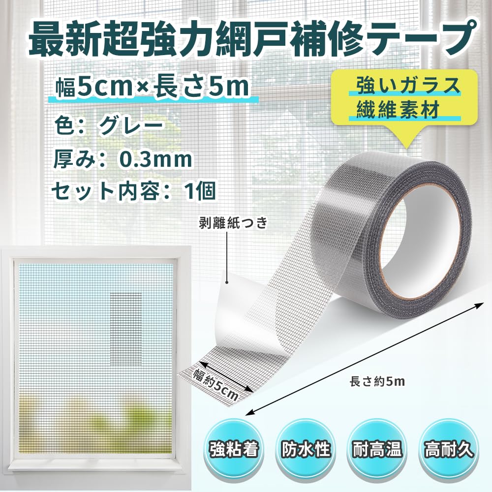 網戸補修テープ仕様:網戸 補修 シール (幅5cm×長さ5m)、厚み:0.3mm、色:グレー、1巻、材質:ガラス繊維、最新の強力ガラス繊維素材を採用、安全て無毒、貼っても目立たない、虫の侵入を防ぎながら、新鮮な空気が流れています!