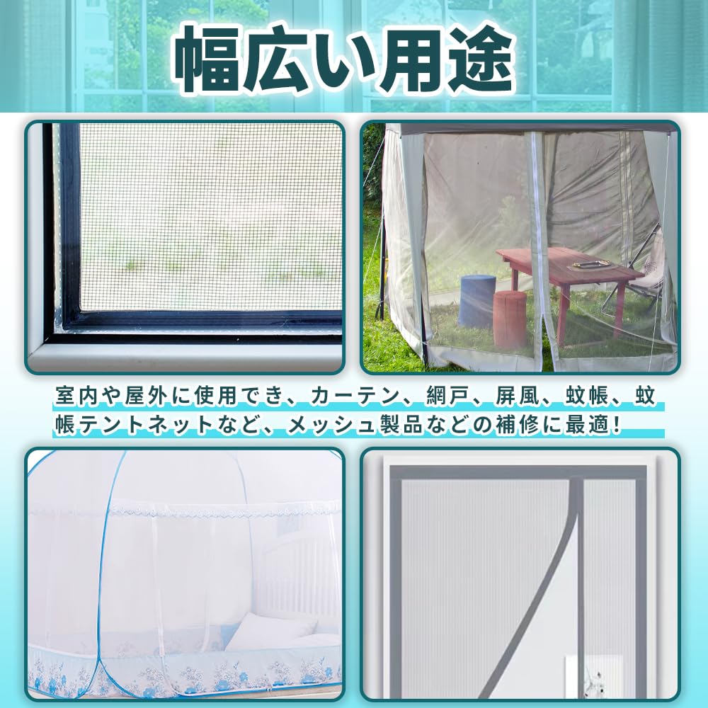 使いやすい、幅広い用途:室内や屋外に使用でき、カーテン、網戸、屏風、蚊帳、蚊帳テントネットなど、メッシュ製品などの補修に最適!