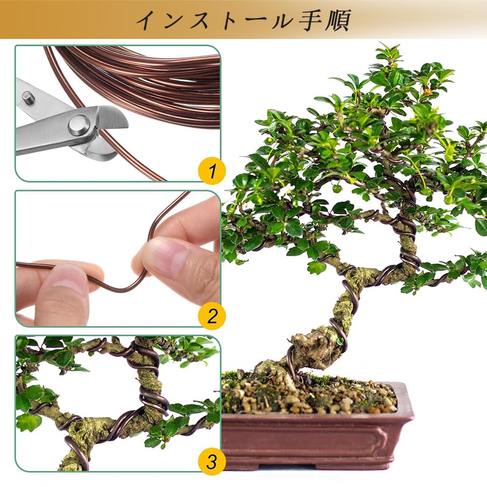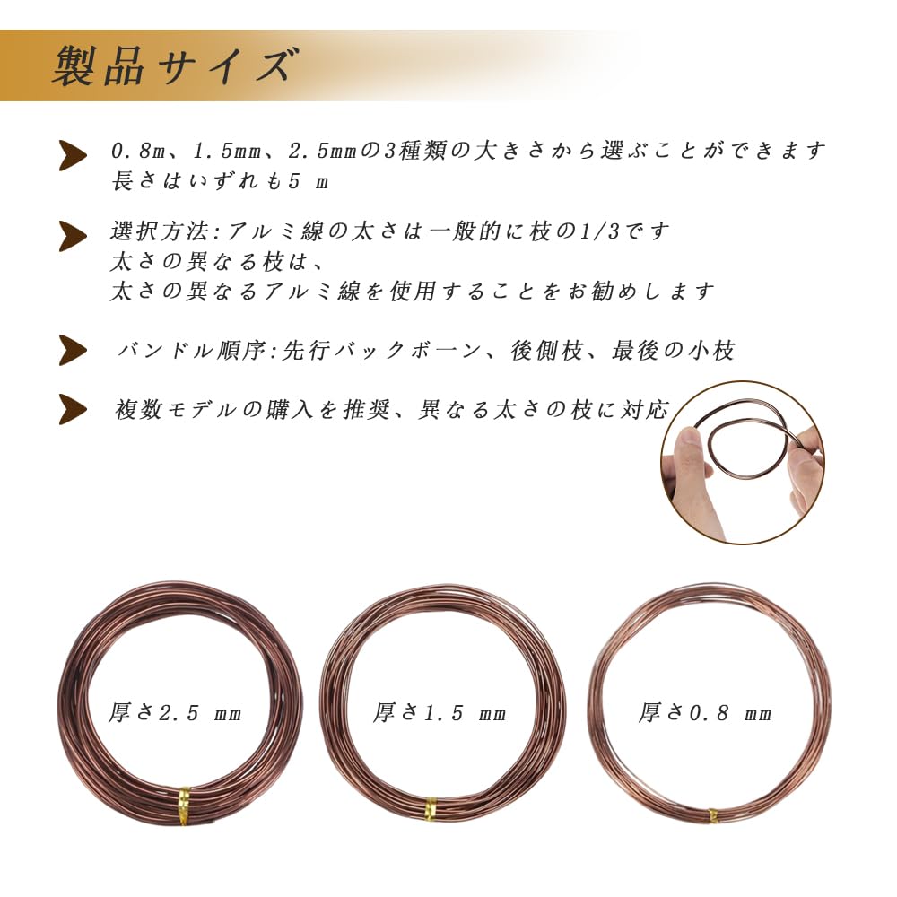 【セット内容】:セットには直径3種類(0.8 mm、1.5 mm、2.5 mm)の長さ5メートルの茶色盆栽アルミニウム線が含まれ、異なる園芸装飾の需要を満たすことができる。