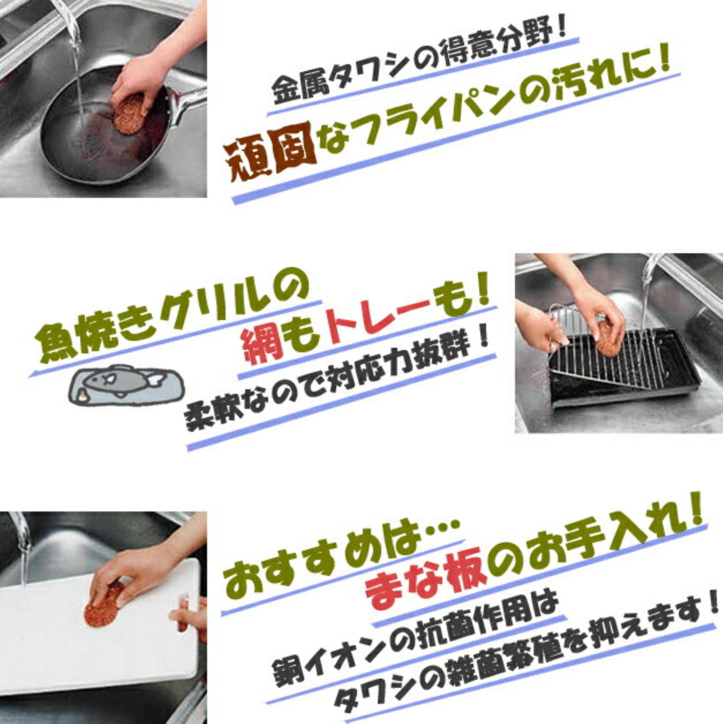 たわしとしてブラッシング。まな板の汚れ落としや、中華鍋などの鉄鍋類などに大変便利です。食器からシンクの洗を始め、 バス・トイレの洗浄に。さらに銅イオンの力で、汚れがつきにくくなる。ヌメリ対策にも