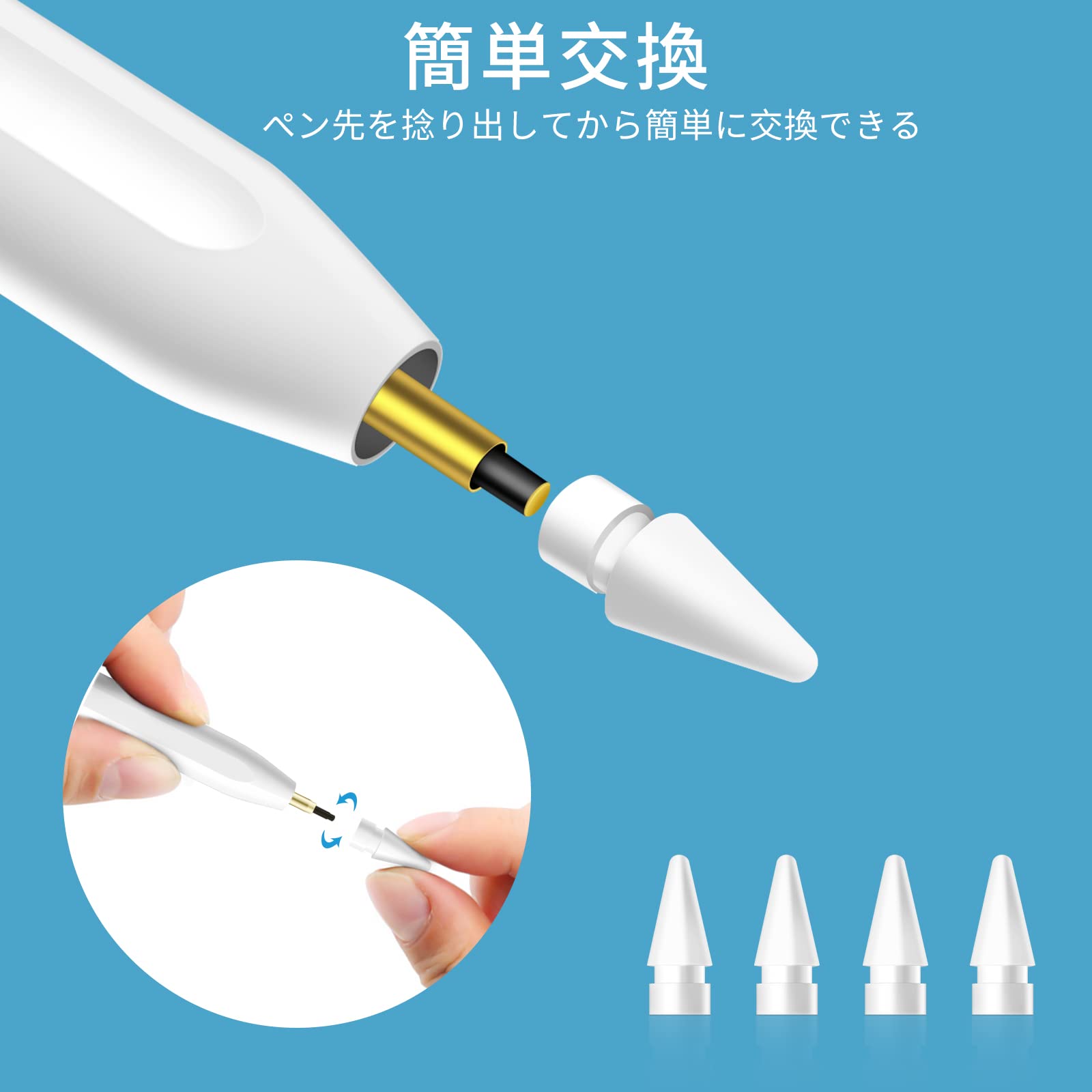 【簡単交換】Apple Pencil純正のペン先と同じ、捻り出し、交換、着装の手順で簡単の交換できます。ご使用中に、何かご不明、また対応ペンシルが判断できない場合、是非お気軽にまでご連絡ください。