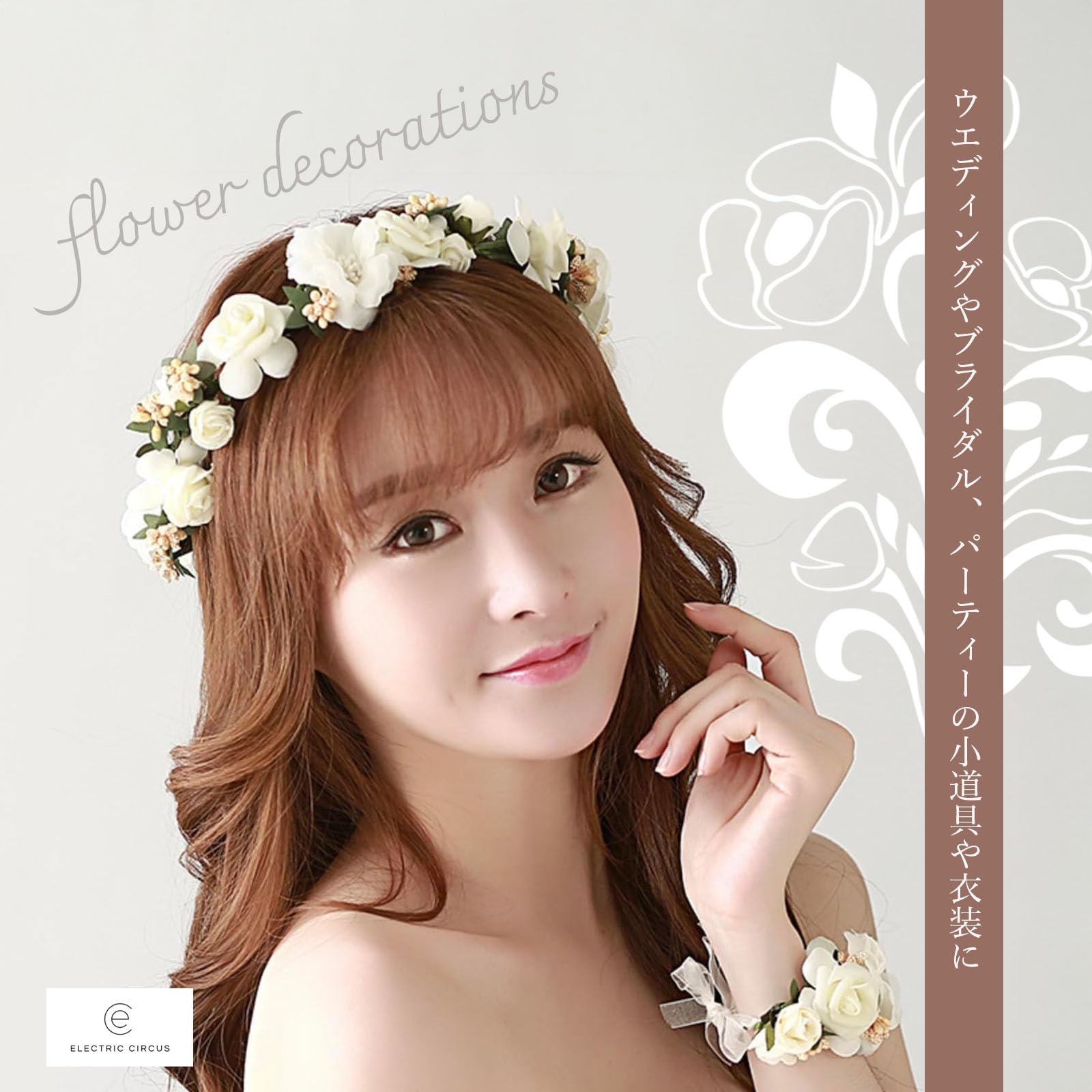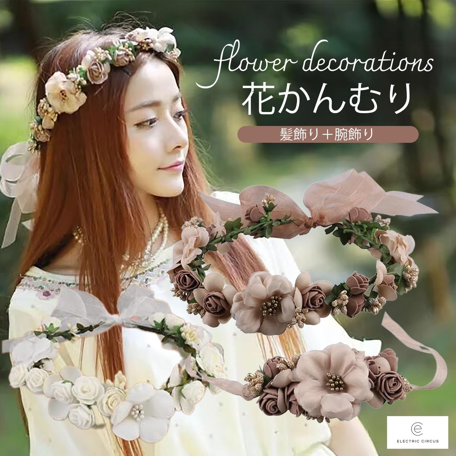 花冠 花かんむり 華やか 髪飾り 腕飾り 2点セット パーティー 結婚式 写真撮影 ウェディング ダンス 衣装 ライブ 発表会 ハロウィン (ブラウン)