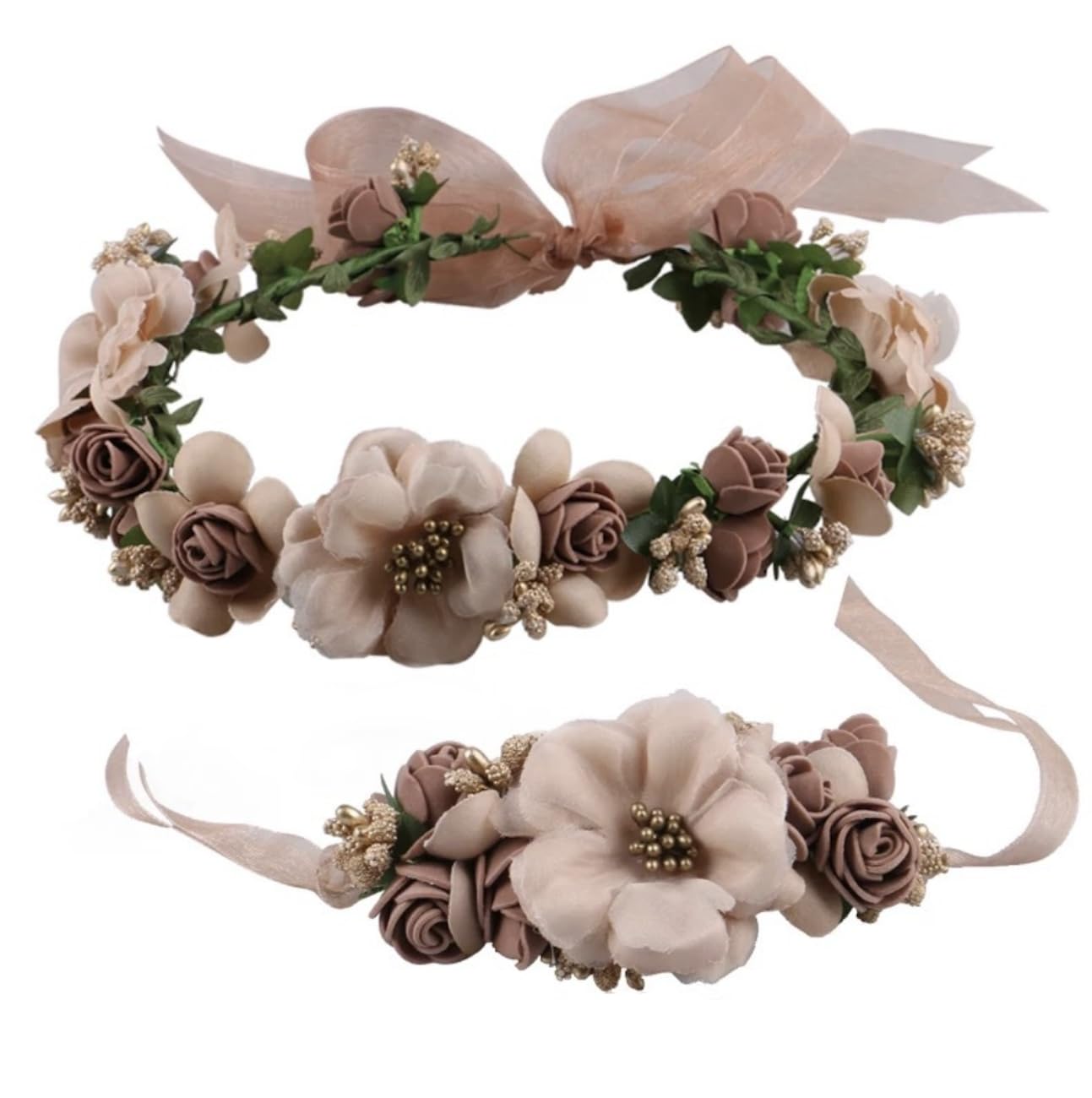 【特価処分】花冠 花かんむり 華やか 髪飾り 腕飾り 2点セット パーティー 結婚式 写真撮影 ウェディング ダンス 衣装 ライブ 発表会 ハロウィン (ブラウン)