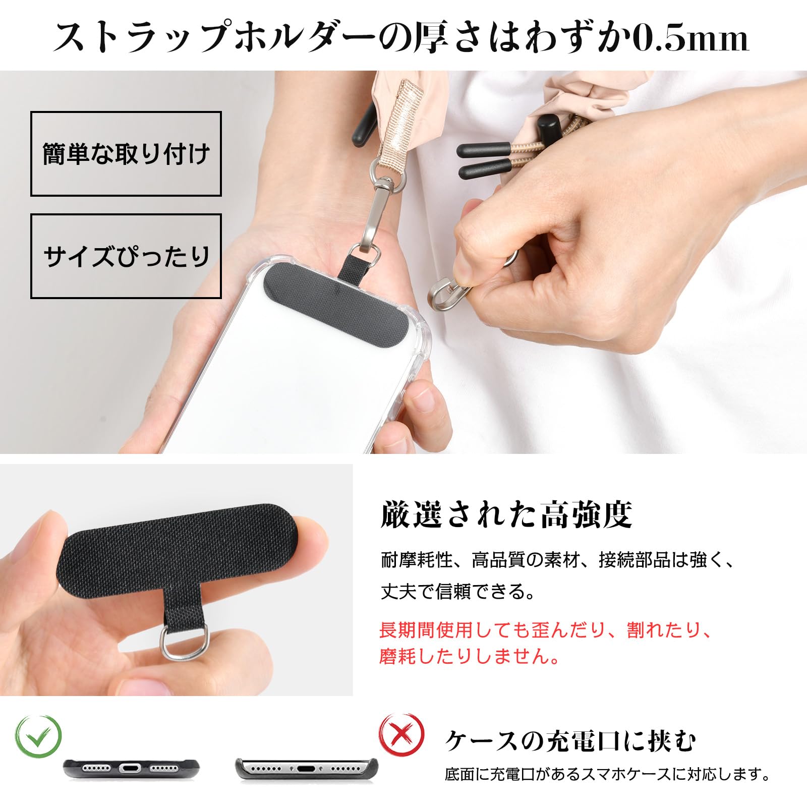 【ストラップホルダー1つ付き】スマホストラップにはストラップホルダーが付いています。 スマホケースの充電口に通して、スマホとケースの間に挟むだけで簡単に使用できます。 とても丈夫で長持ち。