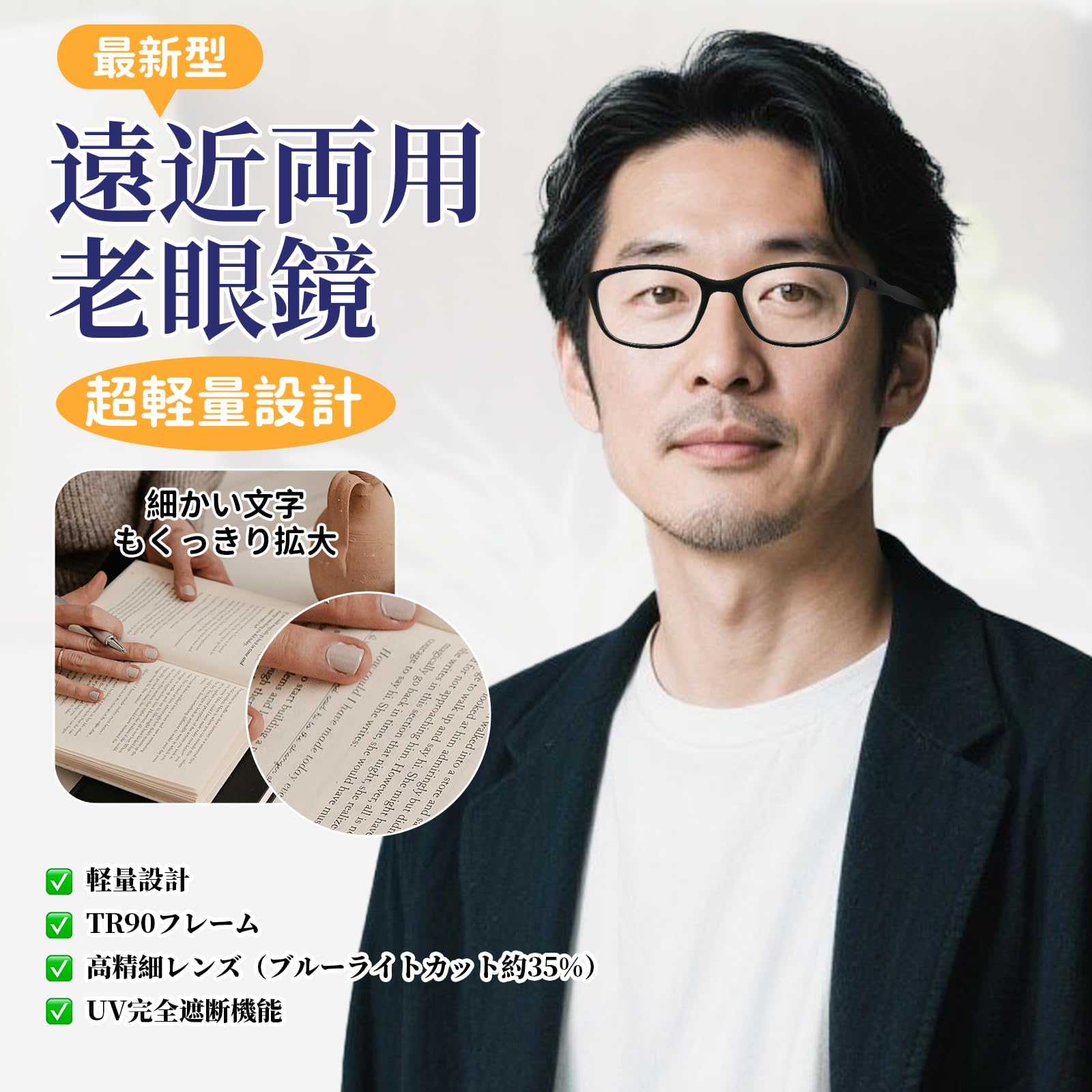 遠近両用眼鏡?人は40代くらいから目の調節力が衰えていき、近くのものが見えにくくなります。近くを見たいときは、眼鏡をかける必要があります。遠近両用メガネは両手を解放するデザインで、持続的に眼鏡を外すのを避け、つける。メガネをかけると下を見るだけで近くが見え、遠くを眺めるときは平視するだけで、通常のブルーレイメガネのように機能します。