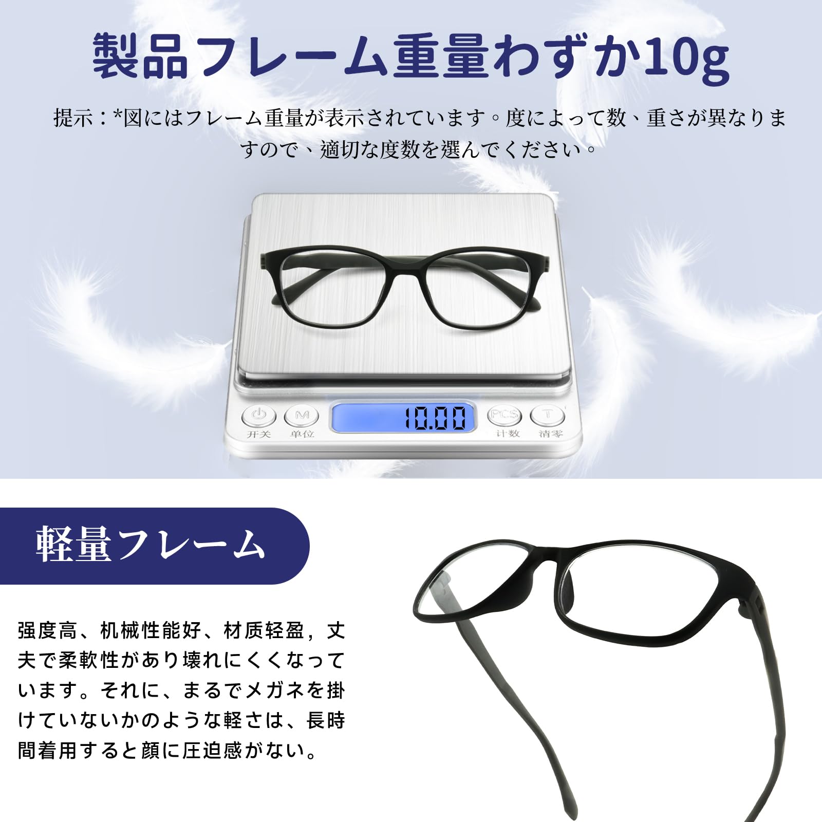 超軽量フレーム?フルリムフレームはTR90素材を採用しており、軽量で耐久性があります。非常に軽く、まるでメガネをかけていないかのような感覚を提供します。長時間の使用でも顔に負担をかけず、快適に着用できます。オフィスでの仕事、勉強、日常の活動など、どんなシーンでも快適な装着感を提供します。また、スタイリッシュなデザインは、どのような場面でも自信とスタイルを引き立てます。