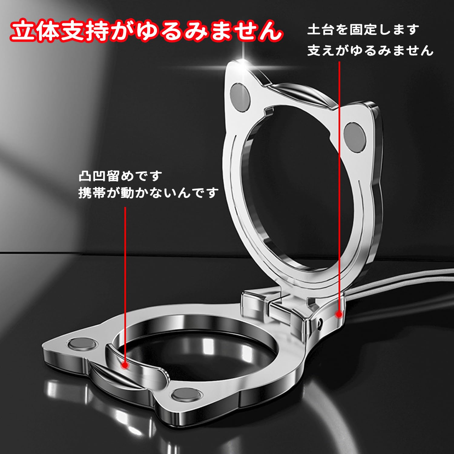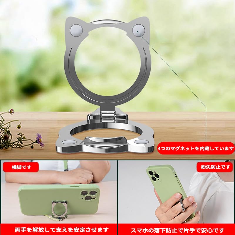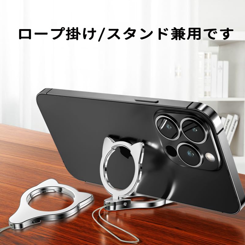 スマホリング スマホスタンド 2in1 落下防止 猫 かわいい 猫耳 スマホアクセサリー (ブラック)スマホストラップ 携帯ストラップ スタンド リングストラップ スマホ落下防止 さびない 丈夫 携帯電話ホルダーストラップ 多機能クリエイティブリングバックル、携帯電話ホルダーとして使用可能