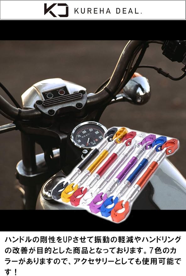 【 ハンドルブレース 】 「KUREHA DEAL」製のハンドルブレースは、レッド・ゴールド・ホワイト・パープル・オレンジ・ブラック・ブルーの全部7色ご用意しております。ハンドルブレースのイメージで「スマホクランプバーでしょ?」ってとらえ方をしておられる方も多いです。ハンドルの剛性をUPさせて振動の軽減やハンドリングの改善が目的とした商品となっております。もちろん色々のカラーがありますので、アクセサリーとしても使用可能です!スマホクランプバーとしても活用可能な便利アイテムとなっております。