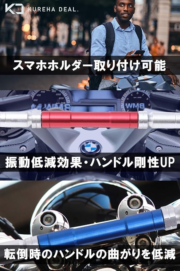 【 ハンドルブレースのメリット! 】 「KUREHA DEAL」製のハンドルブレースのメリットは、主に4つになります。?①「ハンドルの剛性を上げる」本製品を使用によりハンドルの剛性が上がります。?②「振動低減に効果ある」剛性が上がることにより、ハンドルから伝わる振動も軽減する場合もあります。?③「転倒時のハンドルの曲がりを軽減」転倒の際にハンドルが曲がる経験をした方も多いのではないでしょうか?本製品はハンドル固定するアイテムですので、転倒時のハンドル曲げりを軽減するメリットがあります。?④「アクセサリー取り付けのステーとしても使用可能」近年、出前やウーバーなどが流行しています。配達の際にスマホなどでナビする方も多いのではないでしょうか?車種により取り付けできない場合もあります。そんな時に、ハンドルブレースがあればスマホホルダー取り付けの効果もあります!