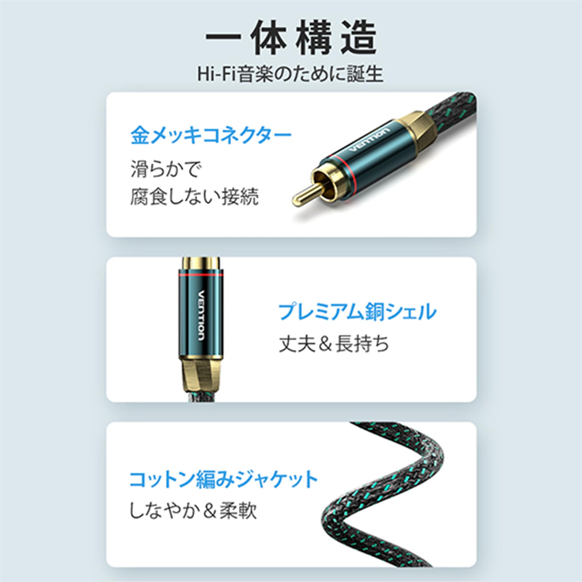 ブランド:Vention 商品名:RCA Male to Male Coaxial オーディオケーブル モデル:BCT カラー:グリーン インターフェイス:RCAオス 電気メッキ:金メッキ コンダクター:シルバーコーティングOFCコンダクター シェル:真鍮+亜鉛合金 シールド:アルミホイル+スズ引き銅編み ジャケット:TPE+コットン編み OD:6.5mm 長さ:0.5m-10m :1年 パッケージ:カラーボックス