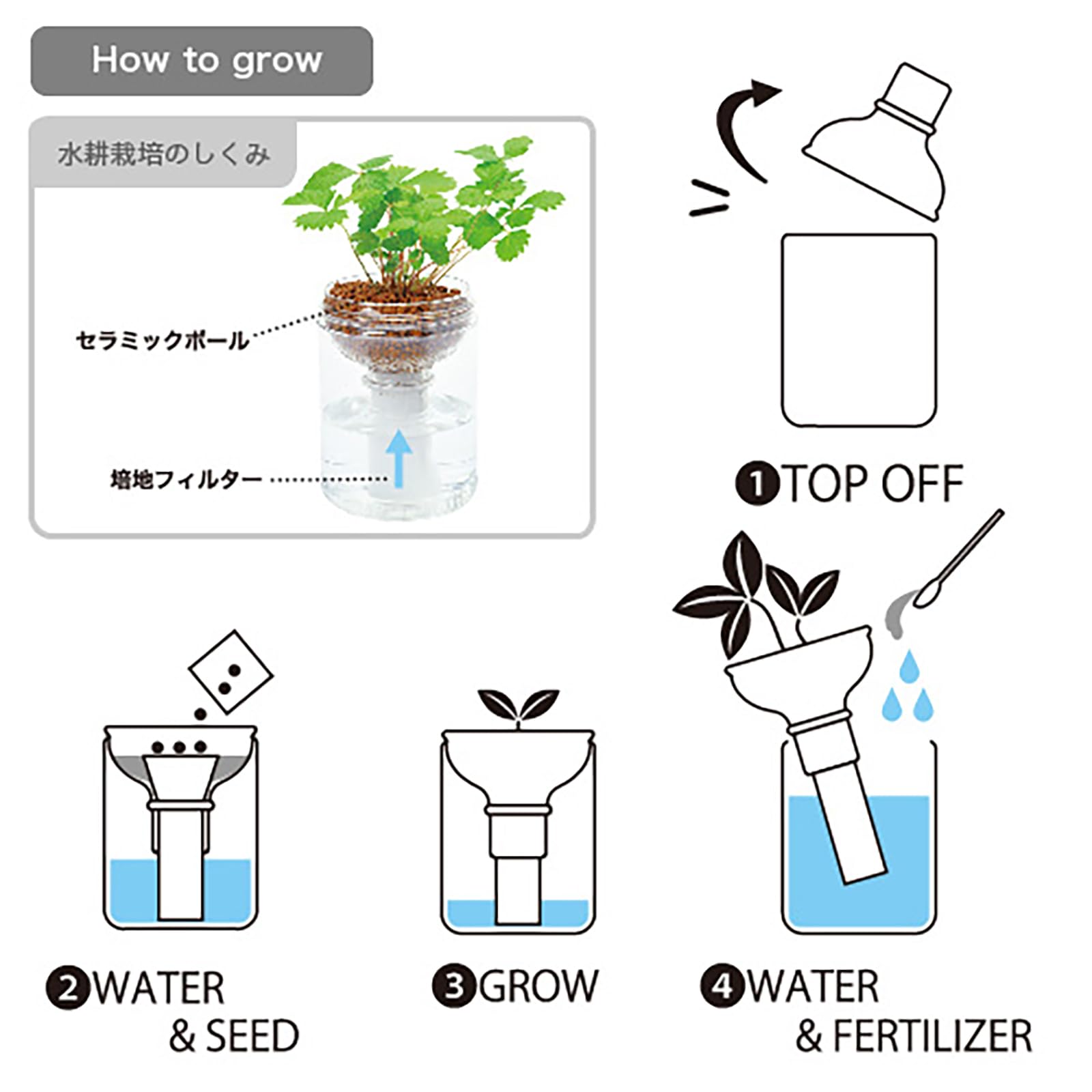 セット内容:ペットボトル型栽培容器,培地フィルター,セラミックボール,肥料,計量スプーン,種,説明書(日本語/英語)
