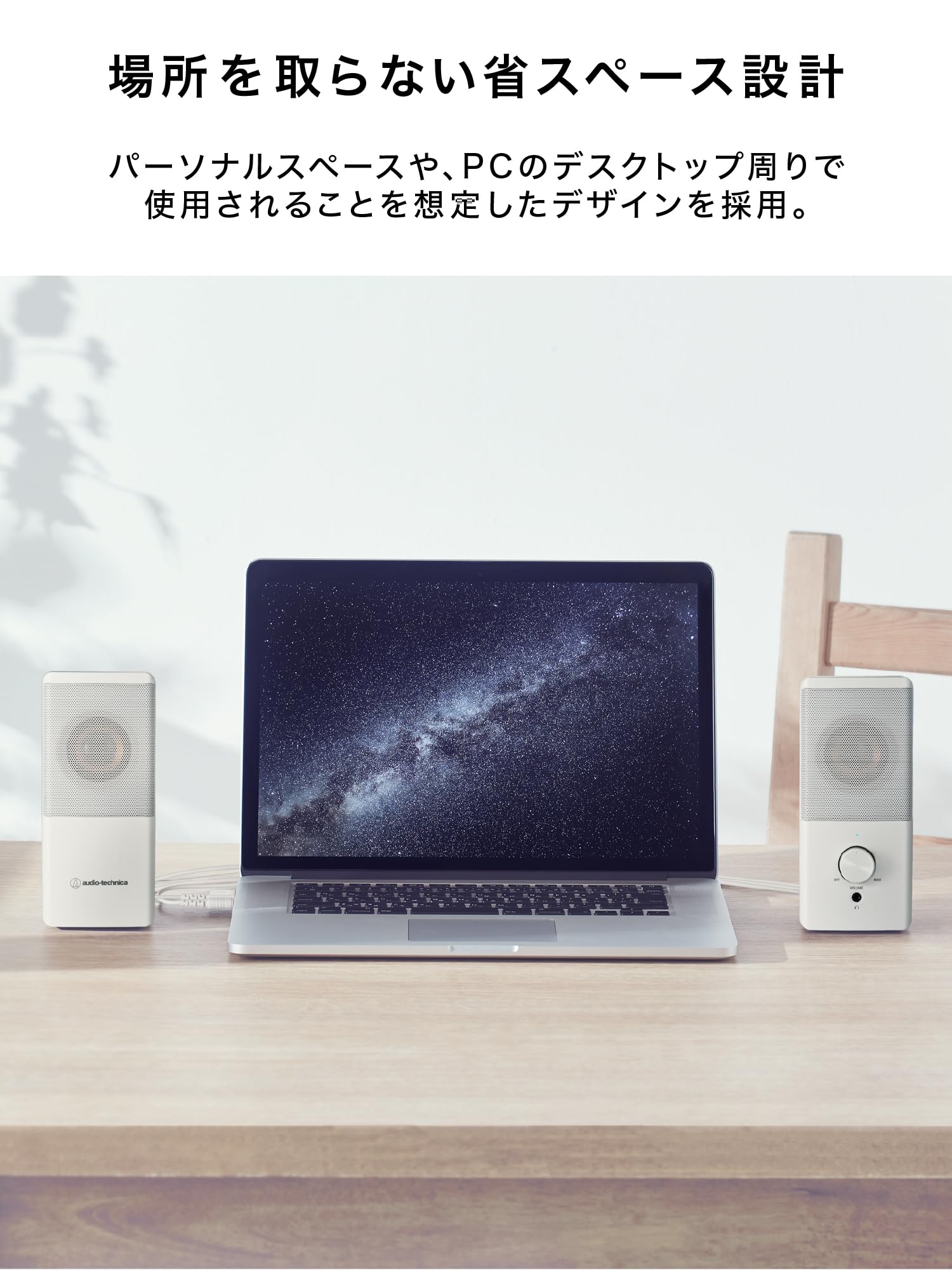 【部屋に馴染みやすいシンプルデザイン、省スペース設計】パーソナルスペースや、PCのデスクトップ周りで使用されることを想定したデザインを採用。コンパクトボディのため、最小限のスペースで使うことができます。PCやオーディオ機器とつながるオーディオ/USBコードの長さは取り回しやすい1.2m。左右のスピーカーをつなぐ渡りコードは、デュアルモニターでも使える1.5mの長さで設計しています。様々なデスク環境で邪魔にならず、馴染みやすいデザインのスピーカーです。