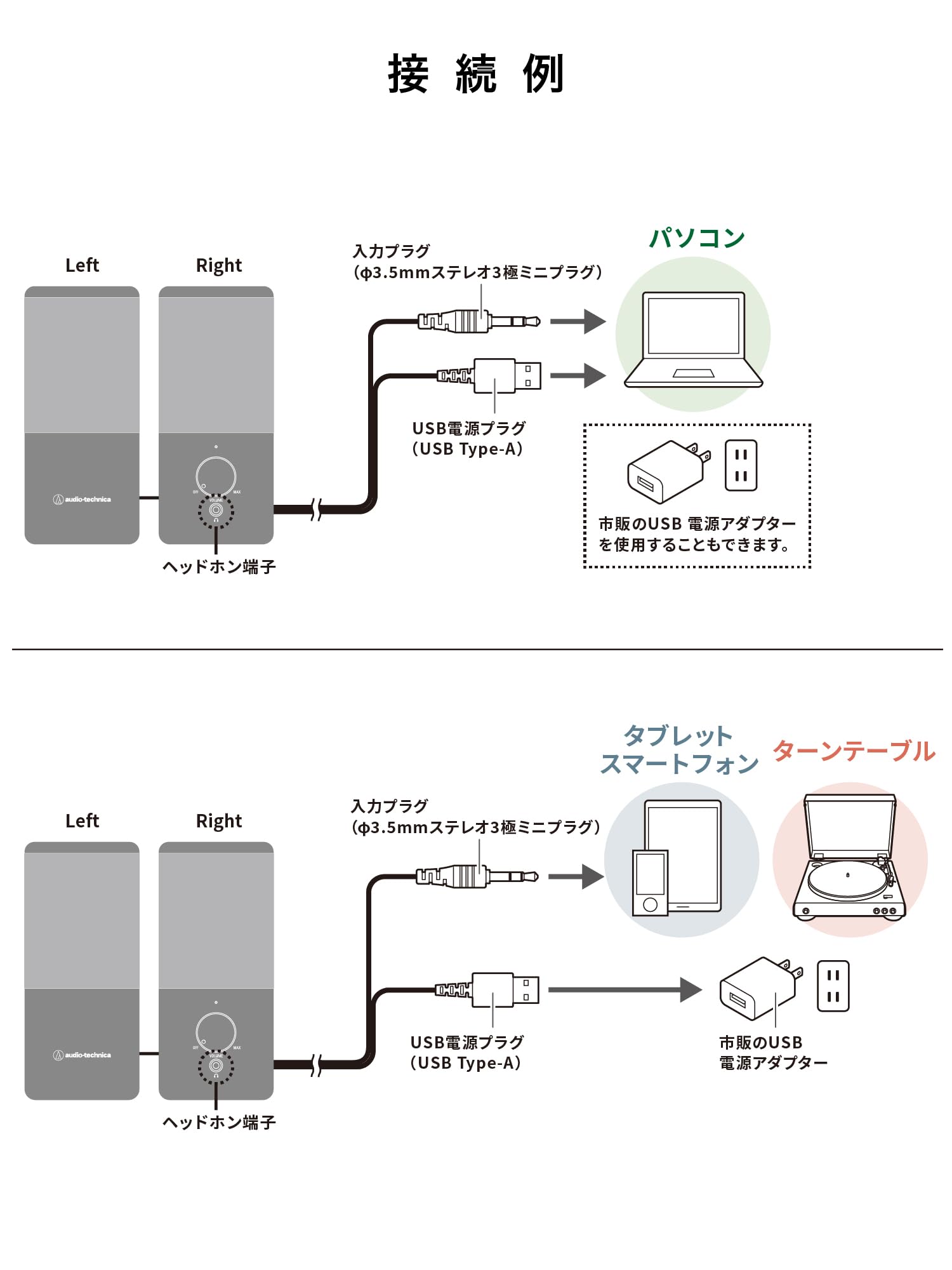 【コンセントのいらないUSB給電タイプ】PCやオーディオ機器などのUSBポートにUSB Type-Aプラグを、ヘッドホン端子 にφ3.5mmステレオミニプラグを接続すればセッティングが完了。音楽を聴きたいときに、PCやオーディオ機器にある2つの端子に接続するだけで簡単にすぐに使えます。また、有線接続のため、音が遅れて聴こえるような心配もありません。