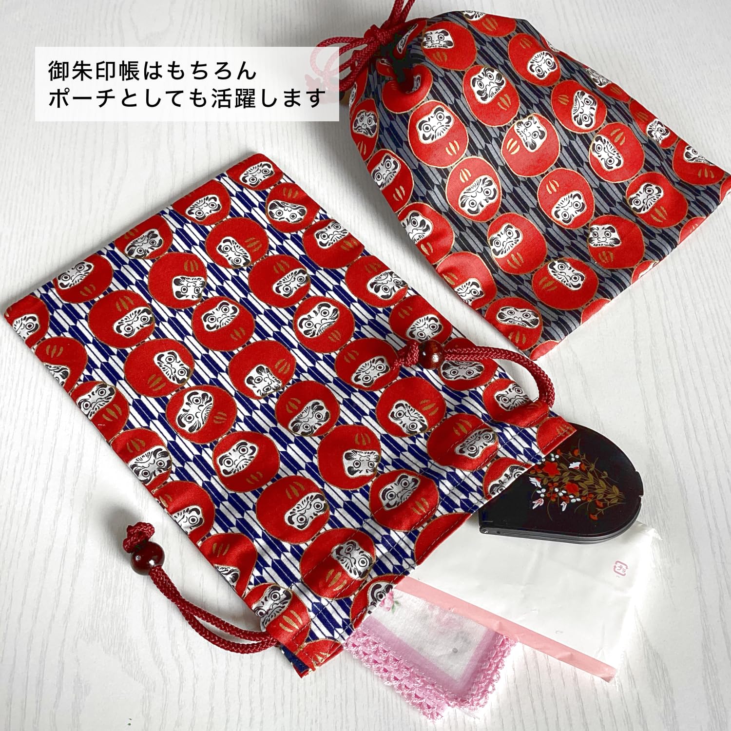 大切なご朱印帳や日常のちょっとしたものを入れるのにちょうど良いサイズの巾着です。