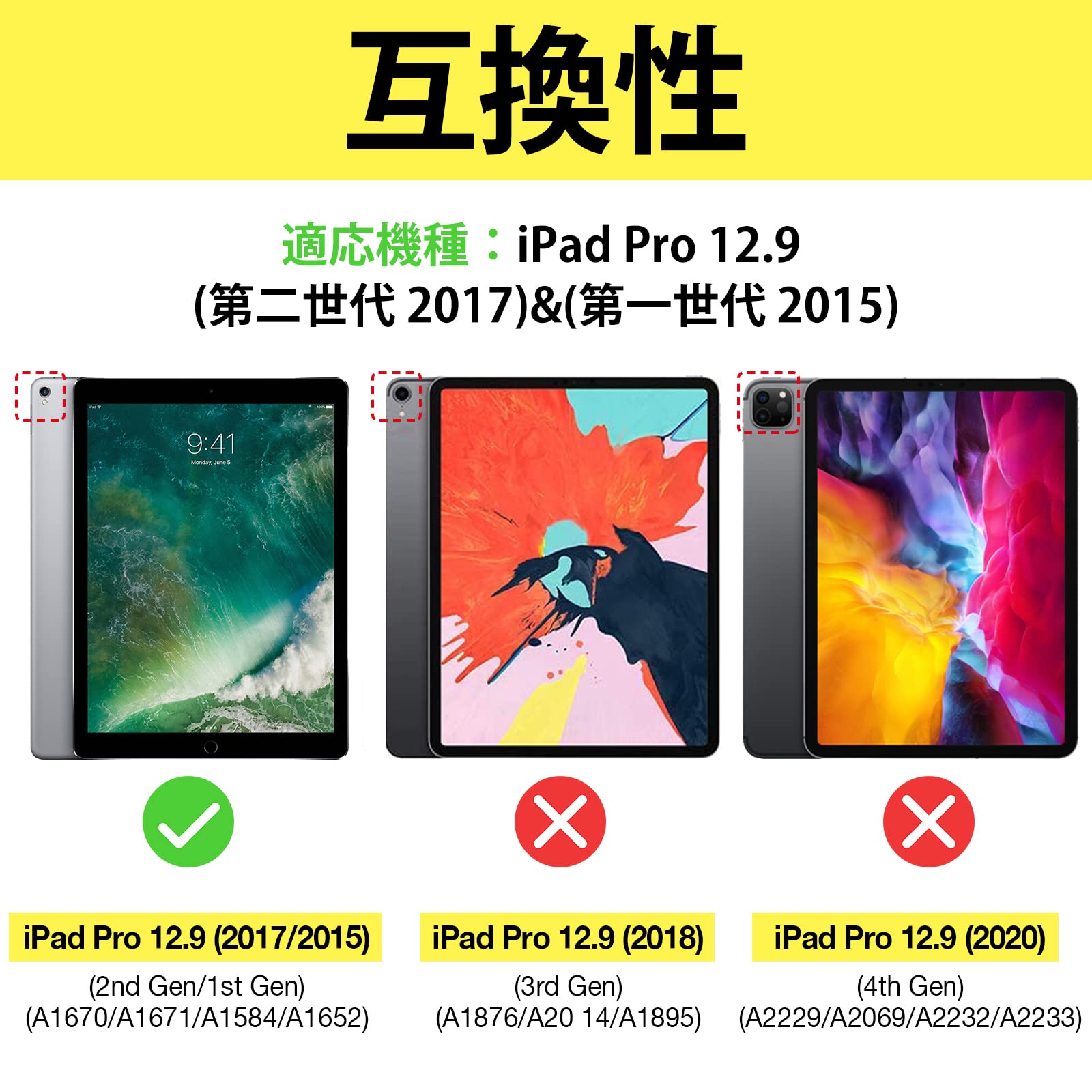 ? 【対応機種】 iPad Pro 12.9 第1世代 2015/ 第2世代 2017 (モデル番号: A1584 A1652 A1670 A1671 A1821)、その他の型式に適用されません。ご設備のモデル番号をご確認いただきます。