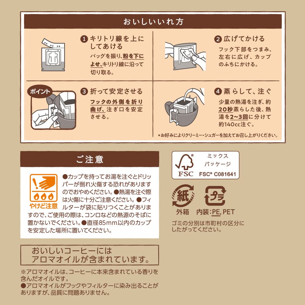 一杯ずつの個包装のフック式のドリップコーヒーで新鮮な香りを、いつでもどこでも手軽においしいカフェインレスコーヒーをご家庭やオフィスでお楽しみください。
