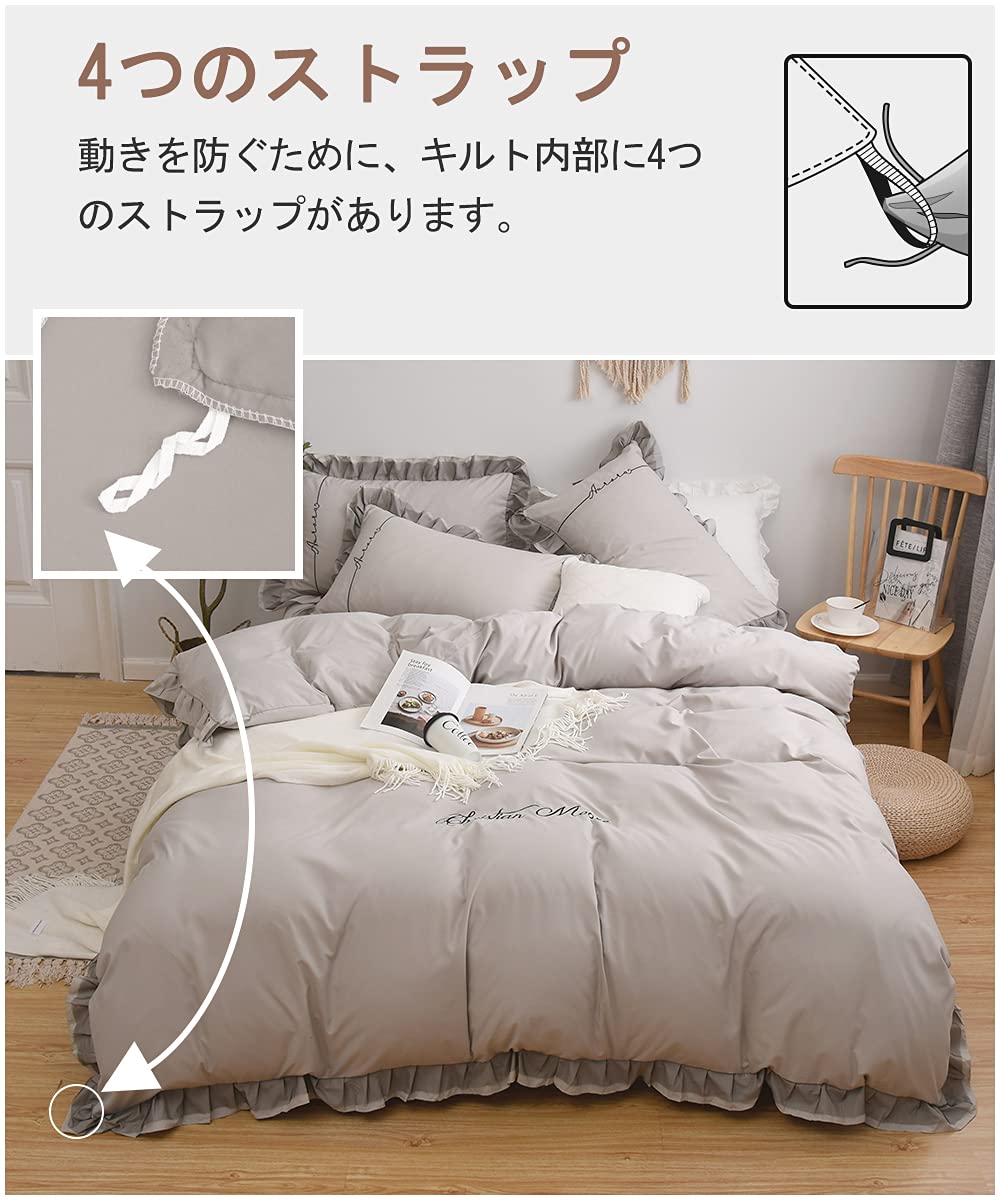 この寝具セットは、シングルサイズのベッドにぴったりの3点セットです。掛け布団カバー(150X210cm)、ボックスシーツ(100X200+30cm)、枕カバー(43X63cm)の3点が含まれています。素材はポリエステル100%で、サラッとした肌触りがあります。ボックスシーツは360度のカバレッジとズレ防止機能があり、子供がベッドに遊んでも皺になりません。また、キルト内部に4つのストラップがあり、動きを防ぎます。刺繍された蓮の葉のデザインは芸術的でエレガントな雰囲気を漂わせます。軽量のポリエステル繊維素材は優れた通気性と速乾性があり、睡眠中の湿度を低下させ、洗濯後も素早く乾きます。洗濯機洗い可、手洗い可で、肌にやさしい起毛素材です。