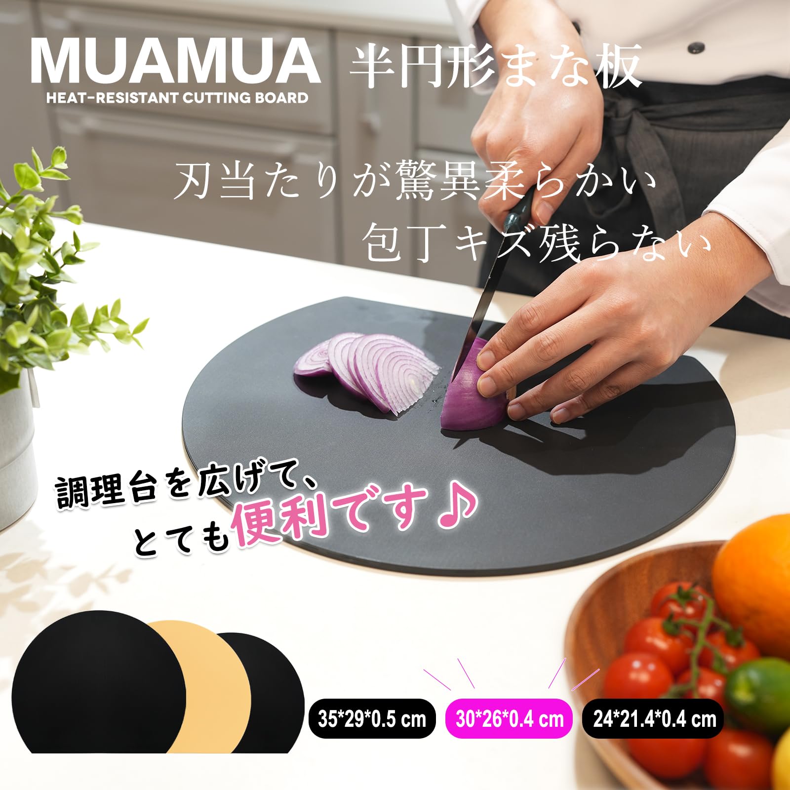 MUAMUA まな板 黒 エラストマー 食洗機対応 丸い 高級耐熱まないた 抗菌 ブラック 柔らかいカッティングボード 約30×26cm 軽い かまぼこ型