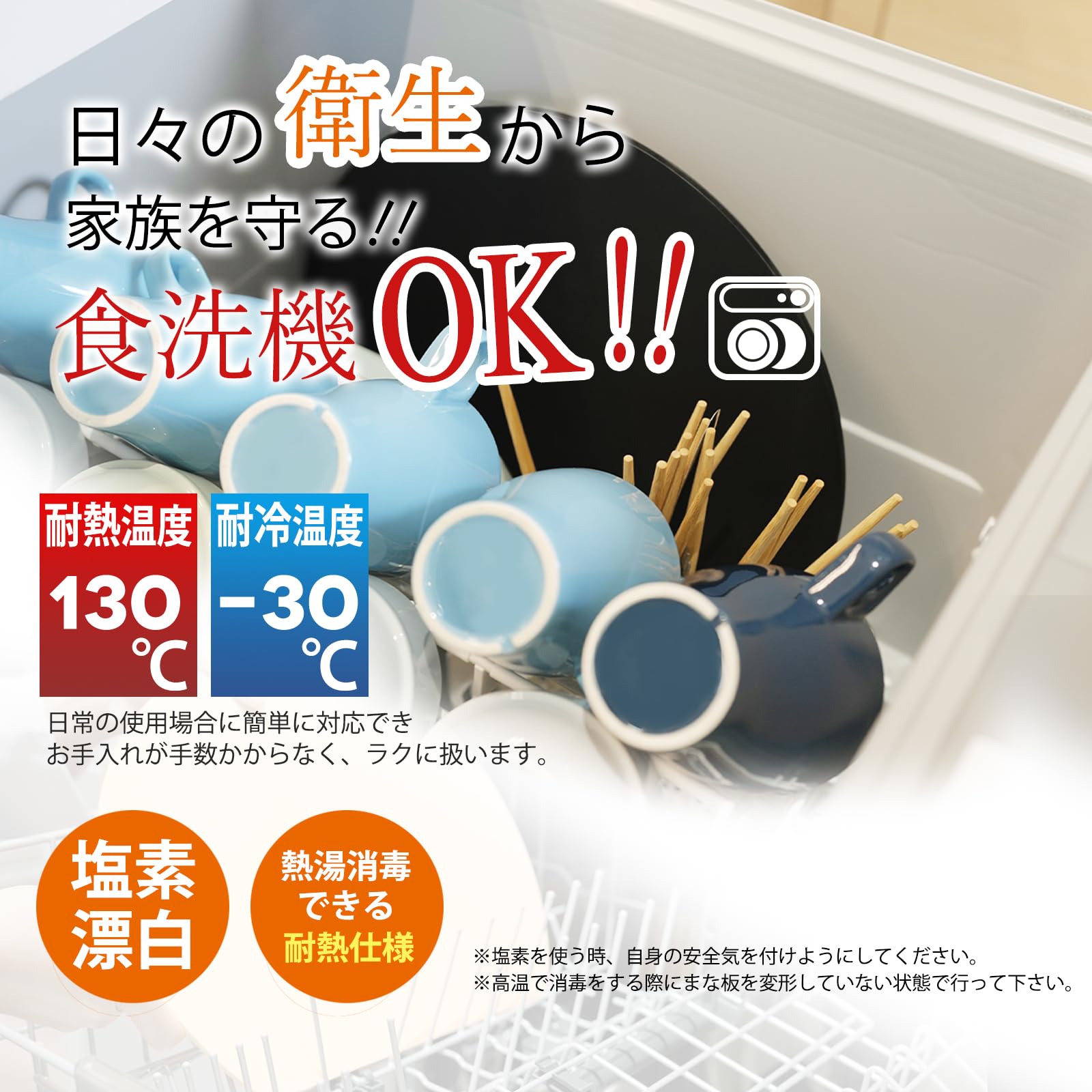 【食洗機対応】使用温度:-30℃〜130℃、食洗機完全対応。熱湯消毒OK・塩素漂白可、お手入れラクラクなまな板。水捌けが良い、洗った後フックにかけて、三分だけ速く乾く。そこですぐ収納しても、衛生面上の心配がないです。●食洗機使用の前に、まないたのサイズを考えて、入れるどうかが事前に確認してください。