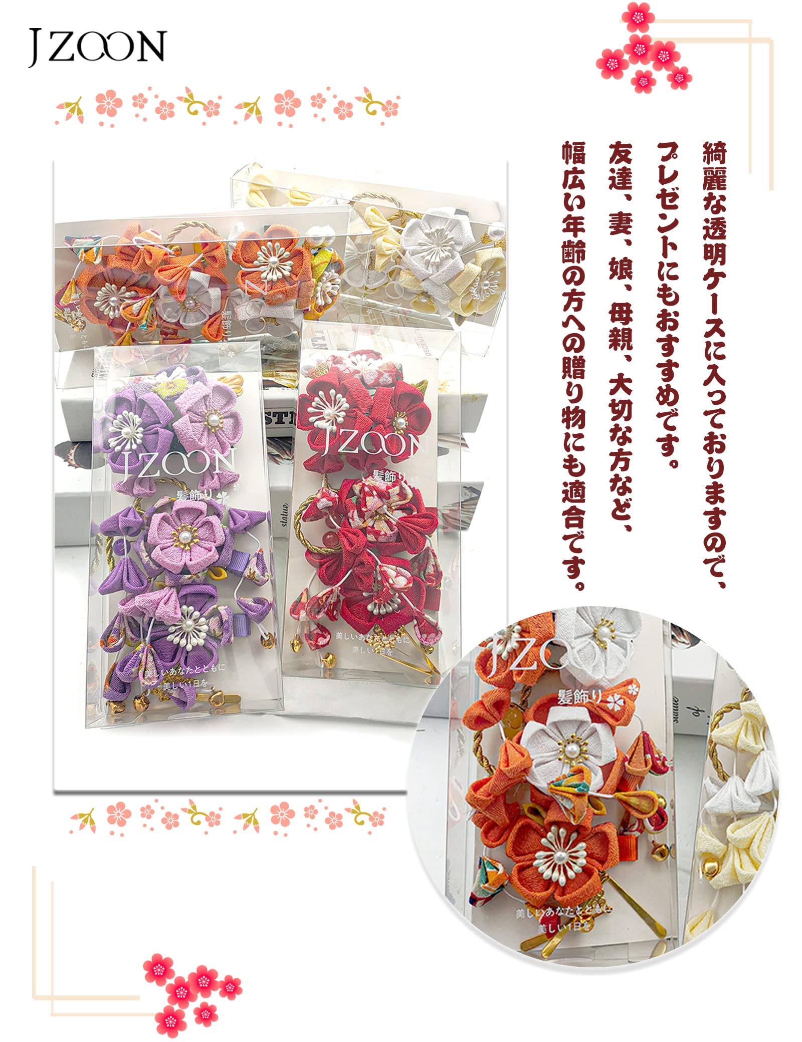 髪飾りは顔に一番近い部分の装飾品として、お召しになる着物の柄や小物の雰囲気にあわせてお選びいただけると着こなしがまとまります。ヘアスタイルを彩り、つまみ細工のJZOON髪飾り3点セットです。4色展開ので、お服の色に合わせ、ご自由に選択いただきようお願い申し上げます。