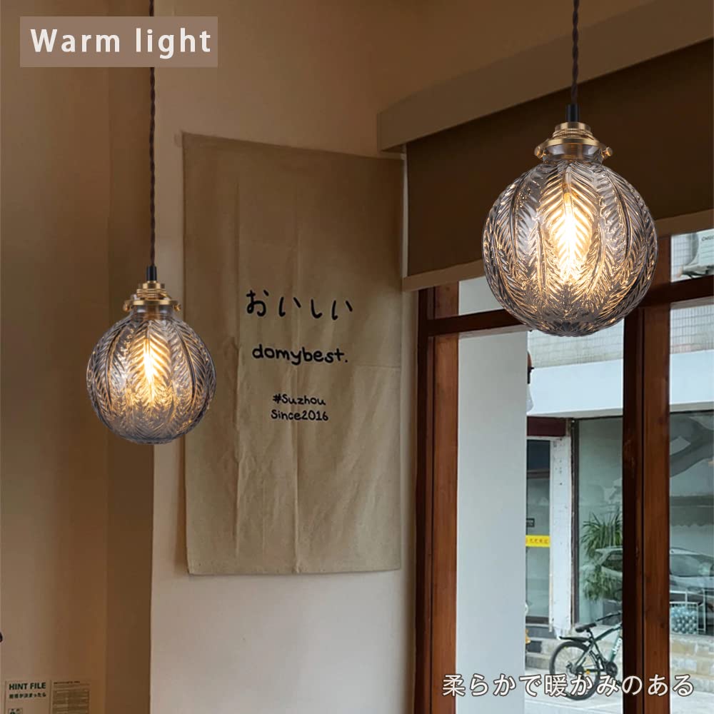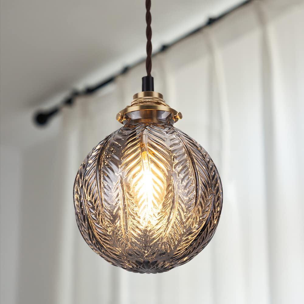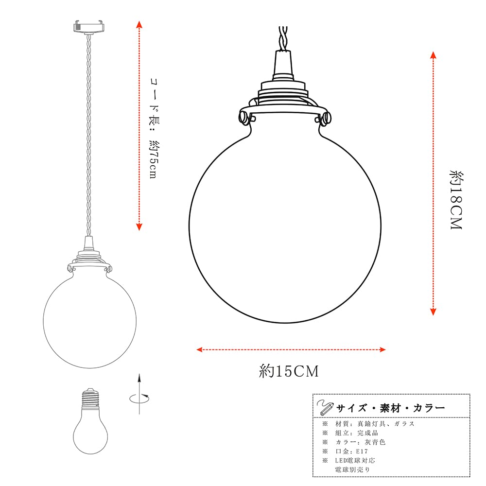 サイズ(約):幅150mm 奥行150mm 高さ180mm コード長:750mm 全高:約930mm 重量:約500g 素材:ガラス、真鍮、ファブリックコード カラー:スモークグレーガラス 対応電球タイプ:蝋燭型 C35 シャンデリア電球(口金E17 直径35mm 長さ93mm) 備考:LED対応、※こちらの商品には電球は付属しておりません。 消費電力:MAX.60W 定格電圧:100V 取り付け方法:引掛シーリング式