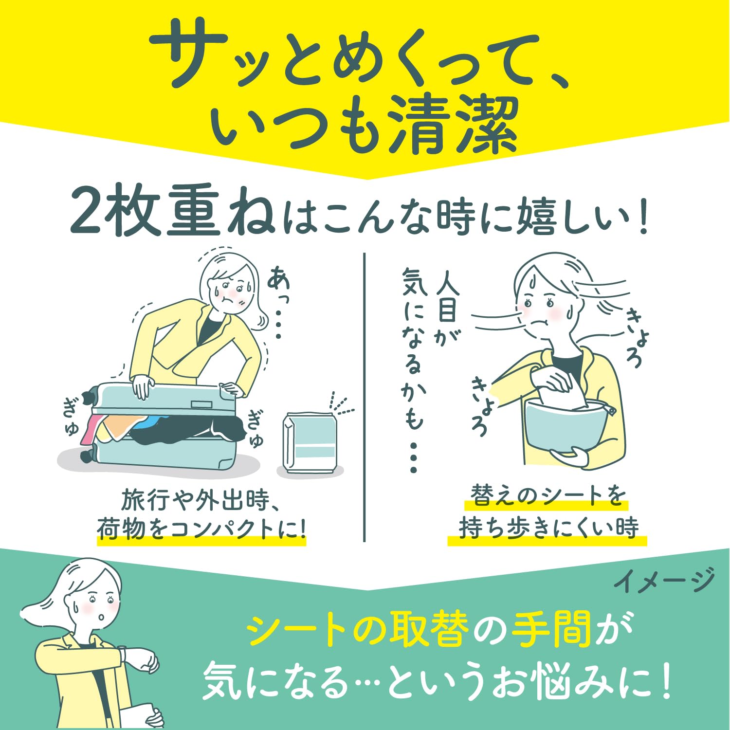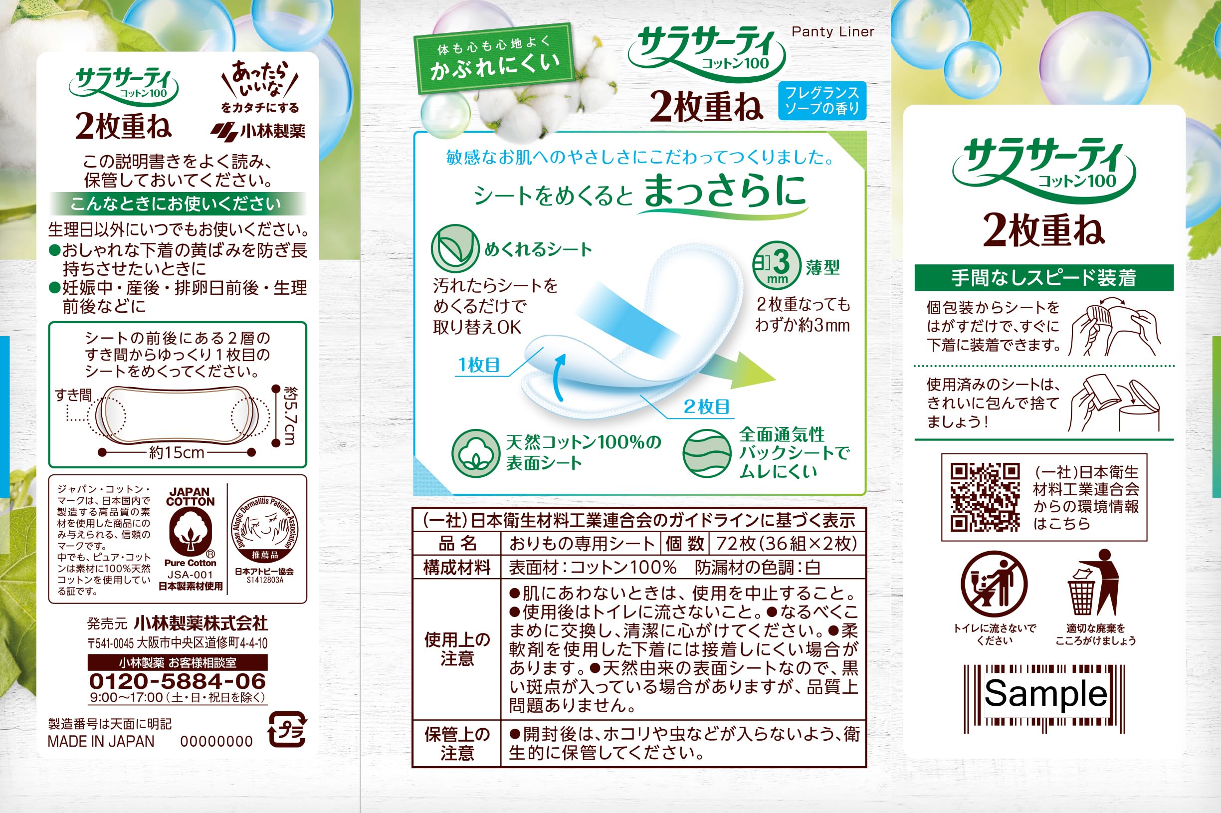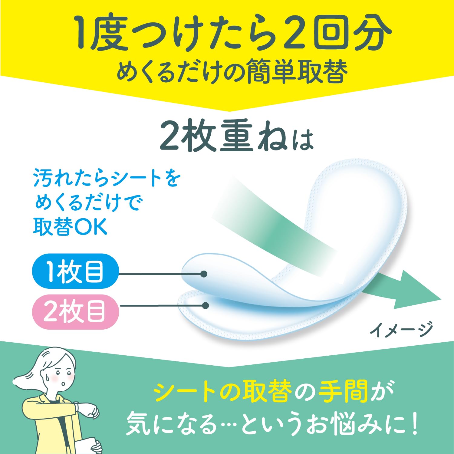 ●シートが2回分になっている、おりものシートです。●清潔感のある「ソープの香り」がついた、おりものシートです。●汚れに気づいた時にめくるだけで、その場で清潔な新しいシートになります。●シートをめくっても、フレッシュ感を感じる香りが続きます。●シートの替えを持ち歩かなくても、手軽に替えられます。