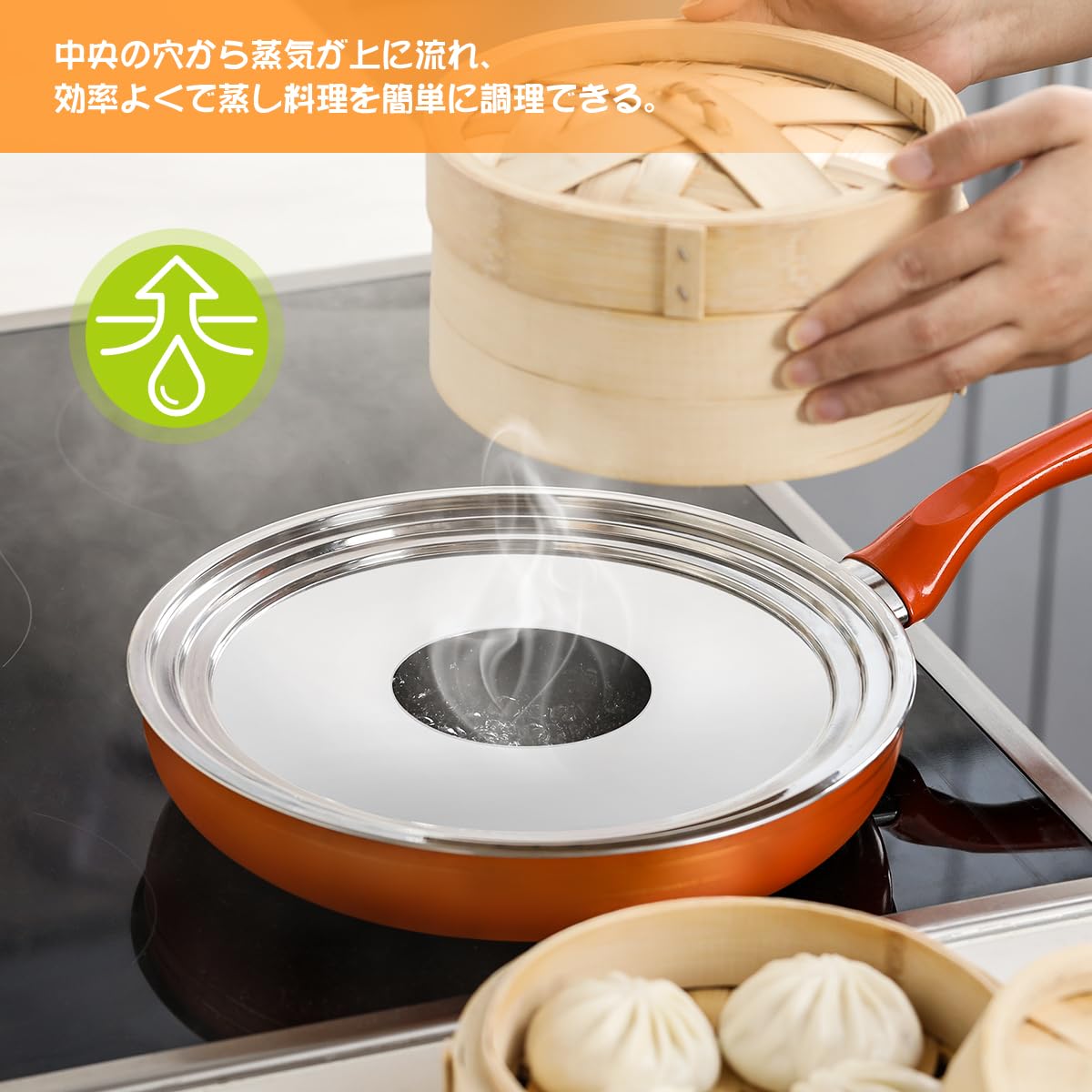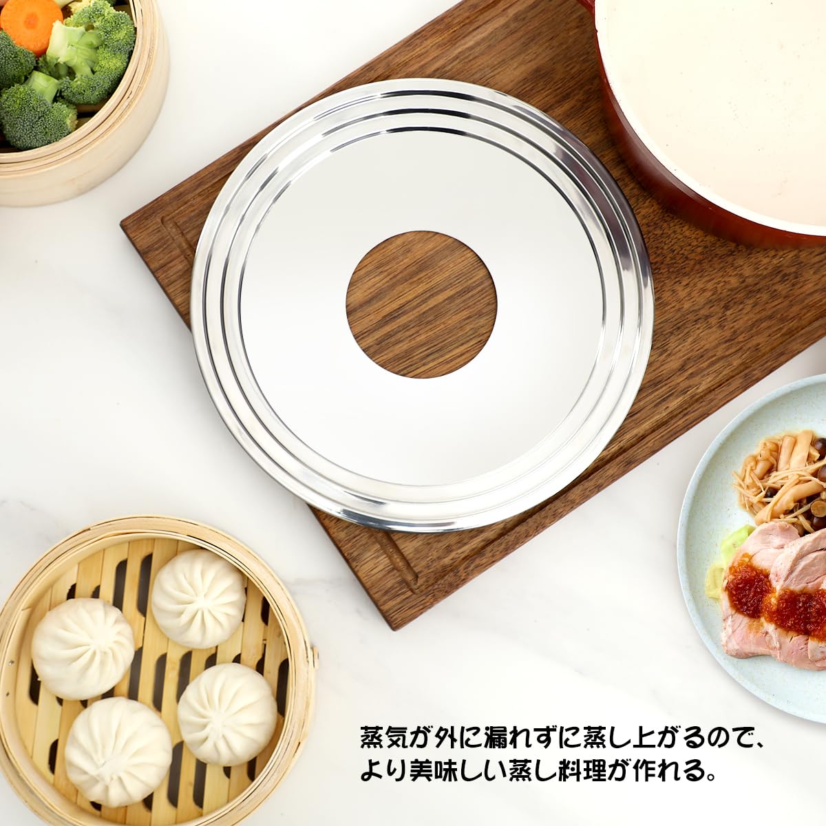 【効率の向上】せいろ 受け台の中央の穴から蒸気が上に流れ、効率よくで蒸し料理を簡単に調理できるようになっています。蒸気が外に漏れずに蒸し上がるので、より美味しい蒸し料理が作れます。