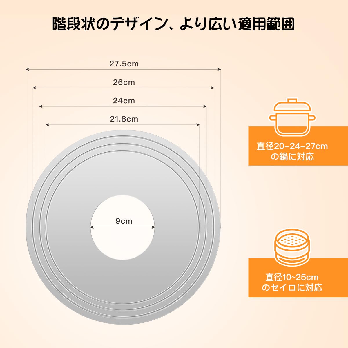 【適用サイズ】階段状のデザインは直径20-24-27cmの鍋に対応しております。せいろ蒸し器の中の蒸し穴は9cm、直径10~25cm(15cm 18cm 21cm 24cm含む)のセイロに対応します。(※21cm以上のせいろはうまく入らない場合がありますのでご注意ください)