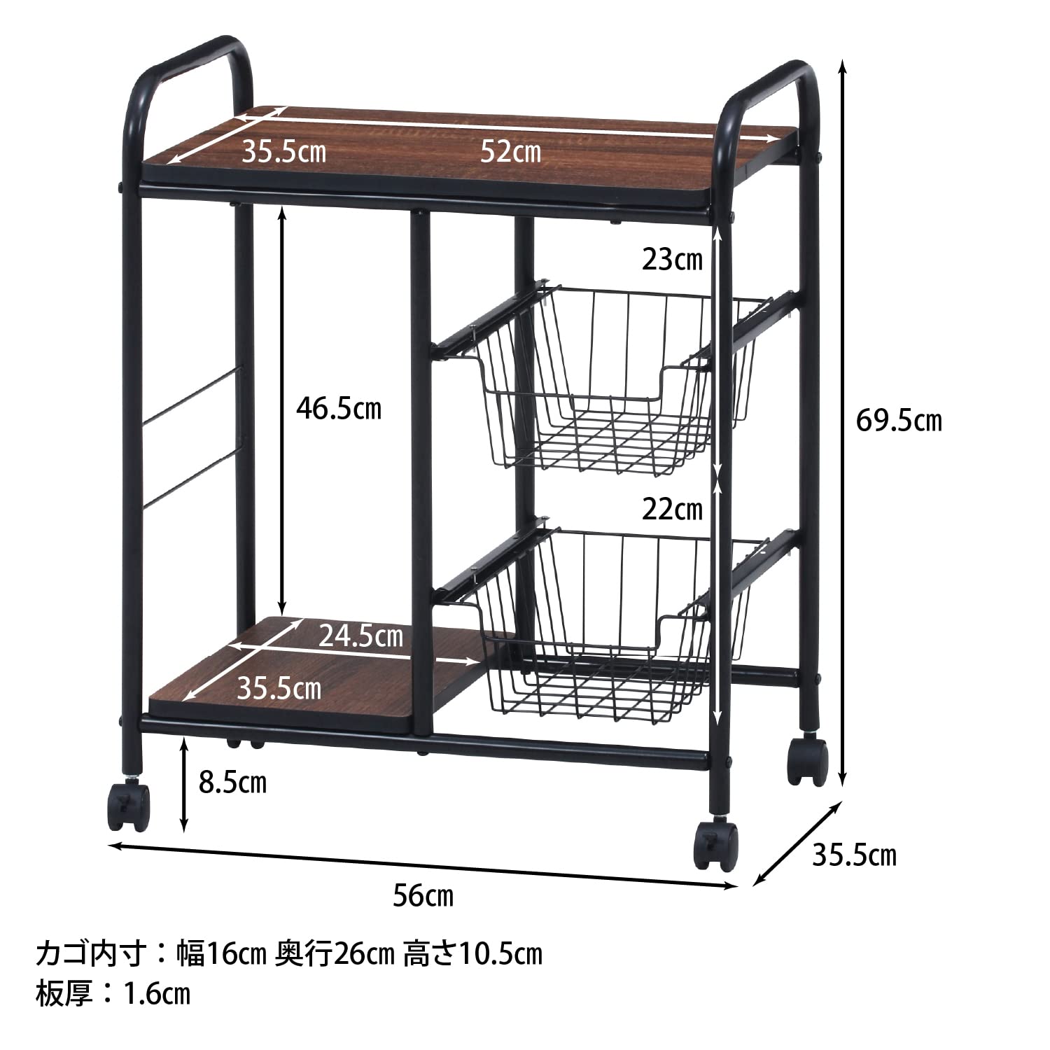 不二貿易 キッチンワゴン キャスター付き キッチンラック レンジ台 一人暮らし スライド棚 引き出し収納 バスケット付き 幅56×奥行35.5×高さ69.5cm ブラック ブラウン 14639