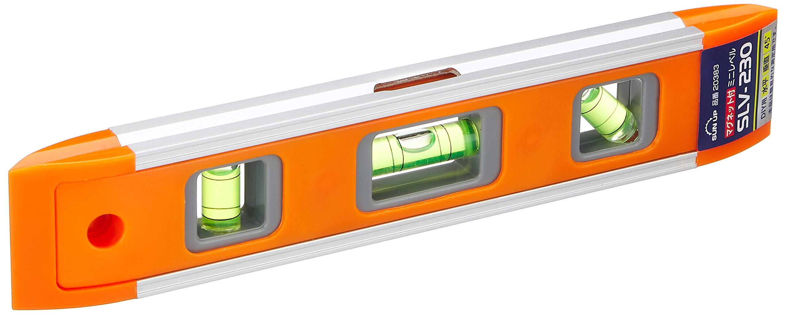 近与(KONYO) SUN UP ミニ水平器 SLV-230 全長230mm 幅40mm 厚み17mm 精度:±1.5mm/1m 気泡管:水平・垂直・45° スリム・小型で持ち運びに便利。 マグネット付き。 簡易測定、DIYに。 本体質量:116g 簡易測定、DIYに。