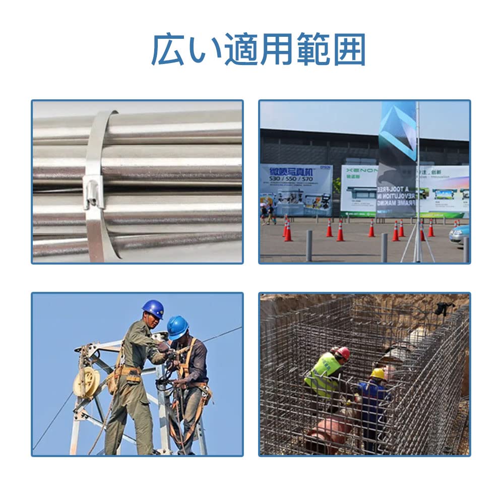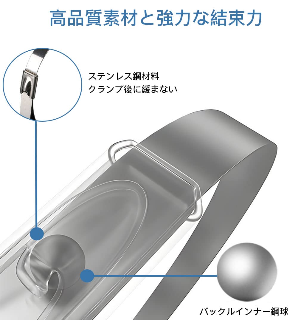 【高品質素材】304ステンレス製で、耐熱でサビにも強い、い特徴があります。雨による錆びが起きにくく、過酷な屋外環境で等の固定や結束に。