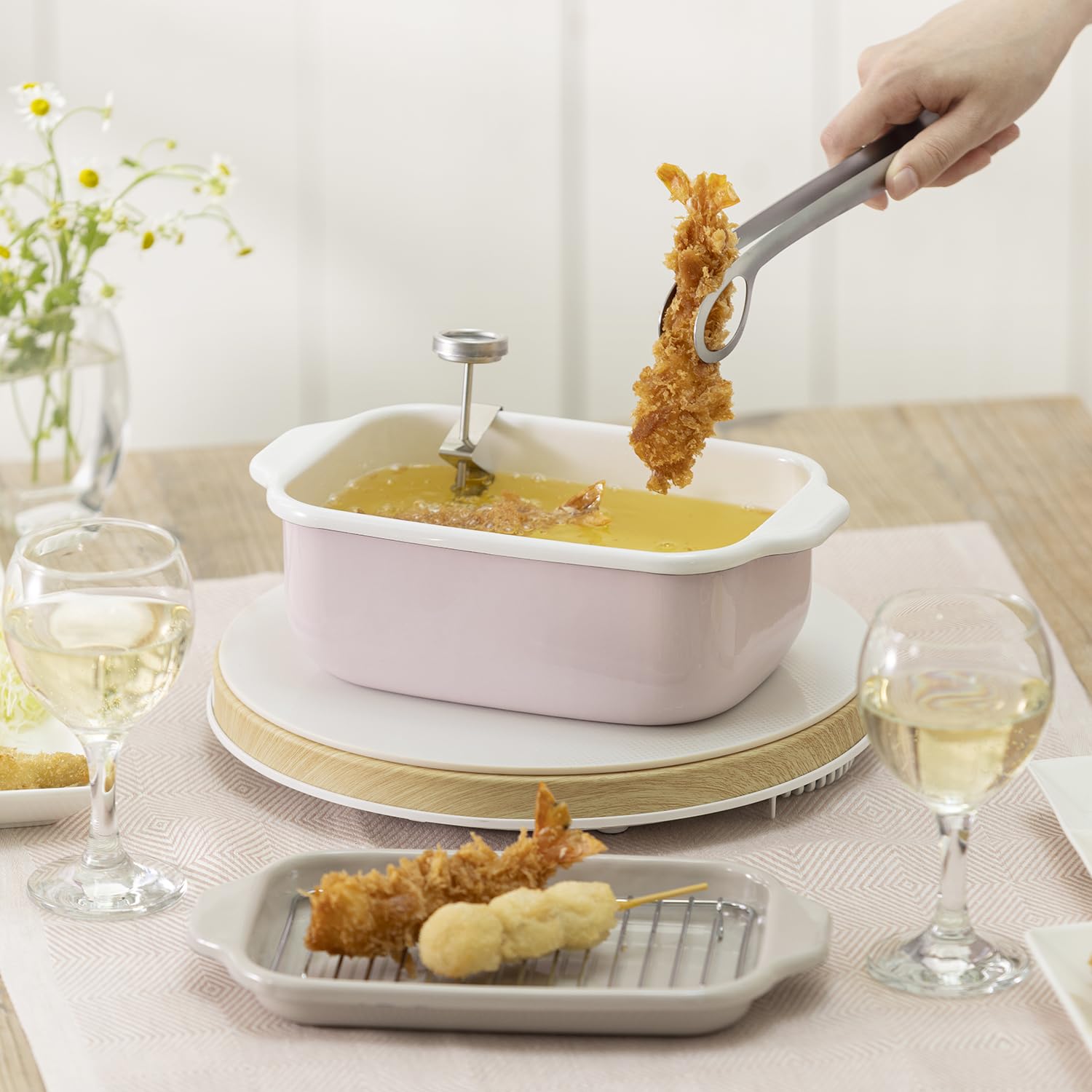 琺瑯の滑らかなガラス質の表面はお手入れがしやすく、熱伝導に優れているのでカラッとした仕上がりに。