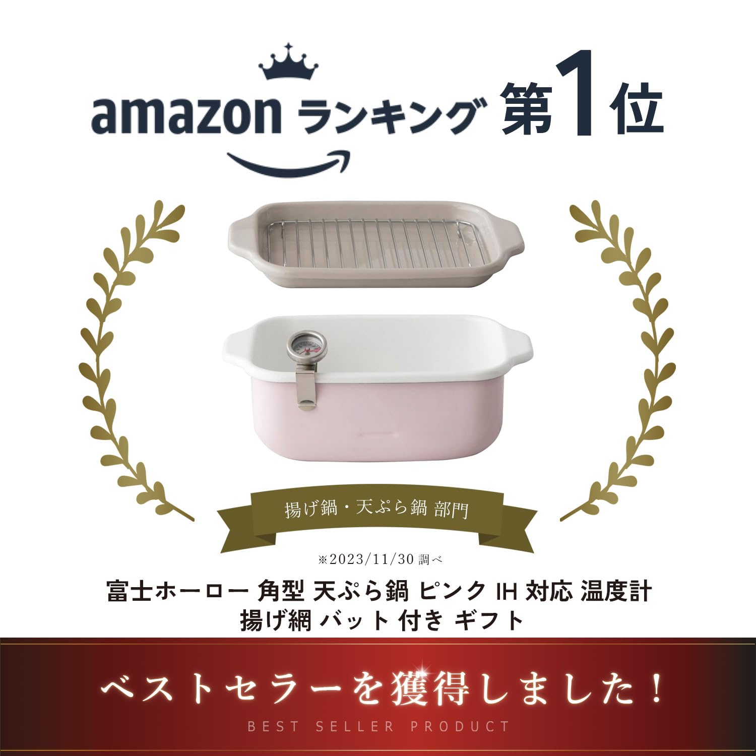 【人気】 富士ホーロー(Fuji Horo) 角型 天ぷら鍋 ピンク IH 対応 温度計 揚げ網 バット 付き ギフト