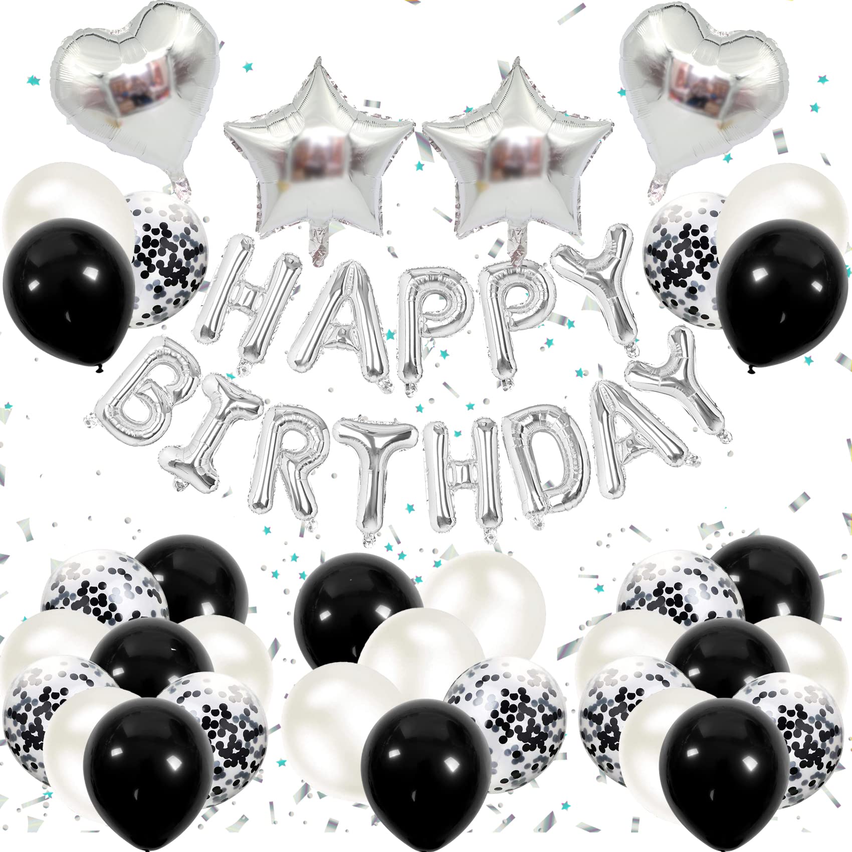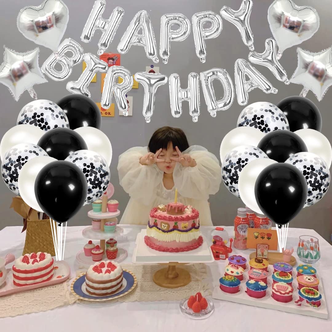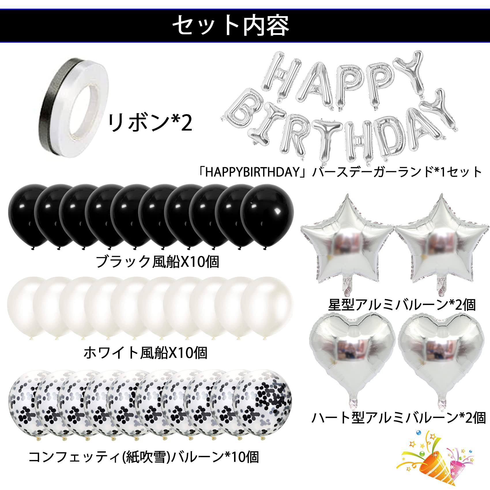 【セット内容】①HAPPY BIRTHDAYバースデーガーランド*1 ②星型アルミバルーン*2個③ハート型アルミバルーン*2個④ブラック風船X10個(約25cm)ホワイト風船X10個(約25cm) ⑤コンフェッティ(紙吹雪)バルーン*10個(約25cm)⑥リボン*2。注意:この商品には空気入れと両面テープがありません。必要であれば、別途に購入してください。