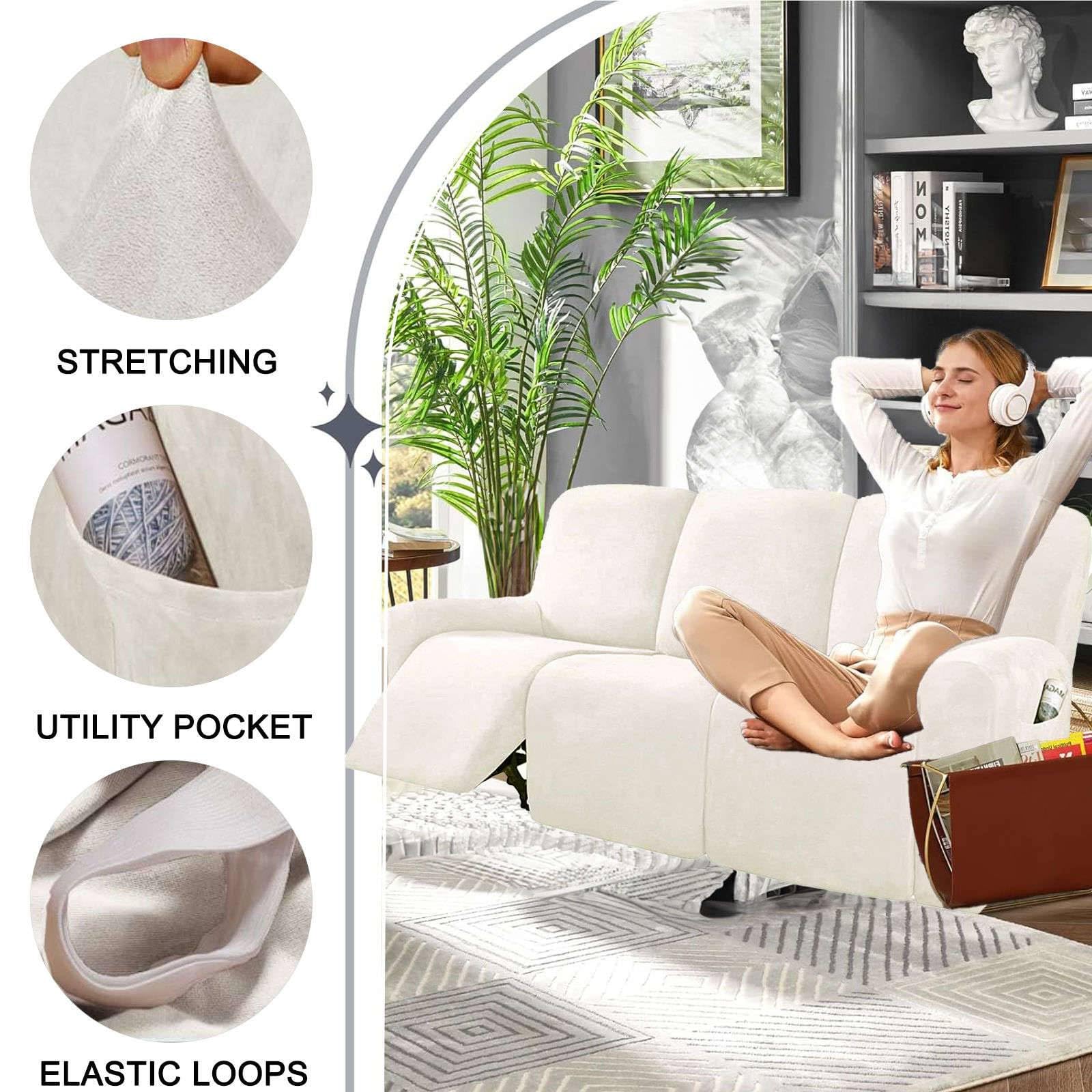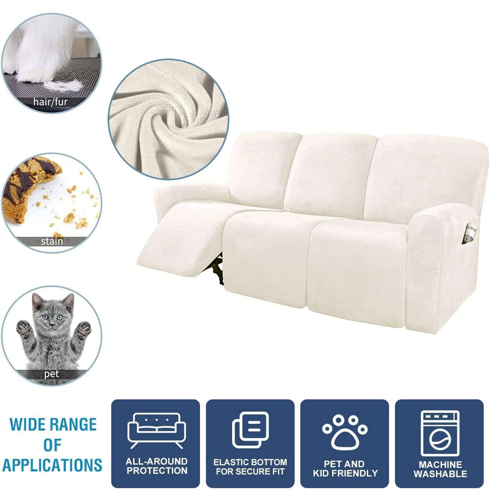 ストレッチ ベルベット リクライニングソファーカバー 3人掛け, 8-分割タイプ 付 サイドポケッ 電動 リクライニングチェア ソファーカバー 滑り止め に適用する 子 ペット-象牙-3人掛け