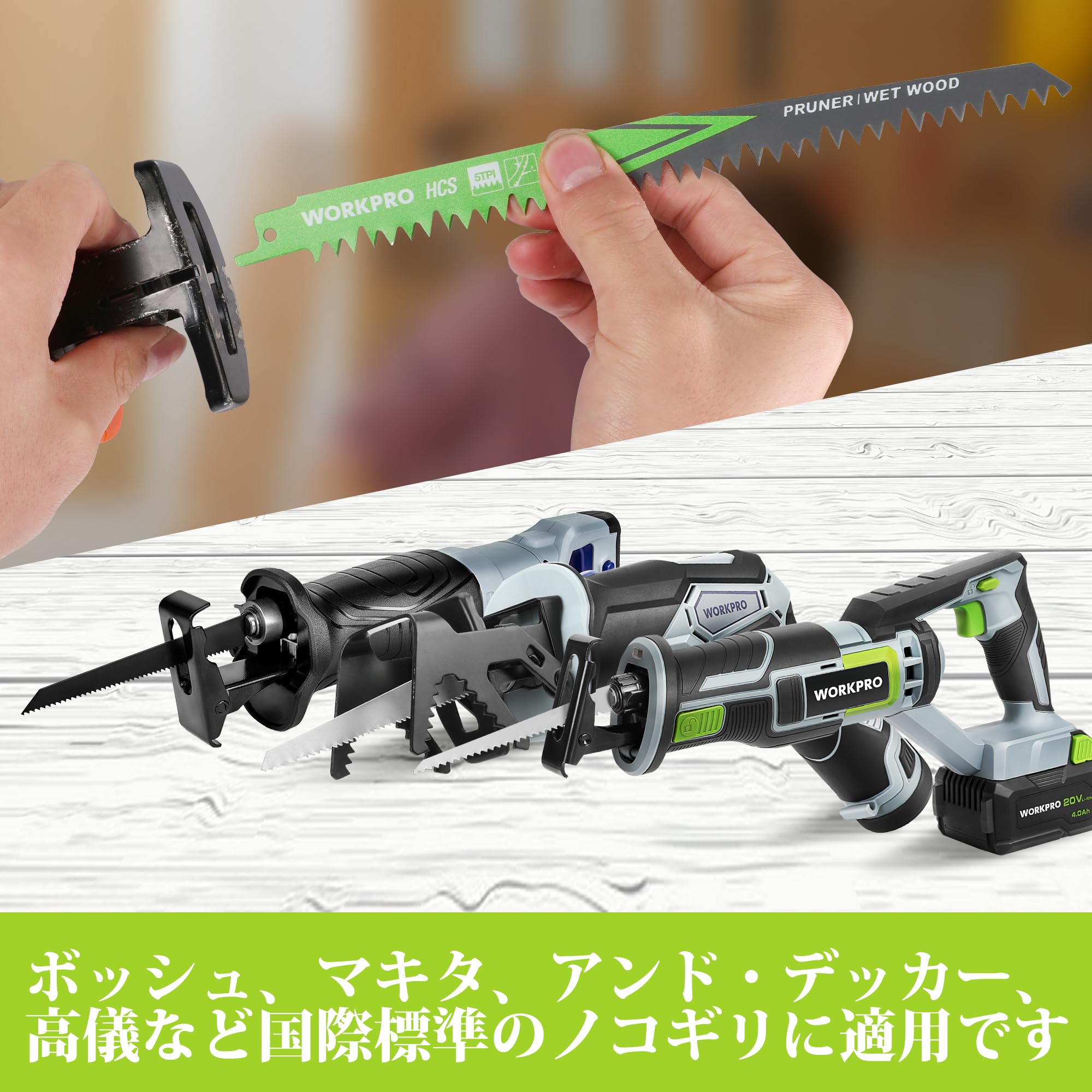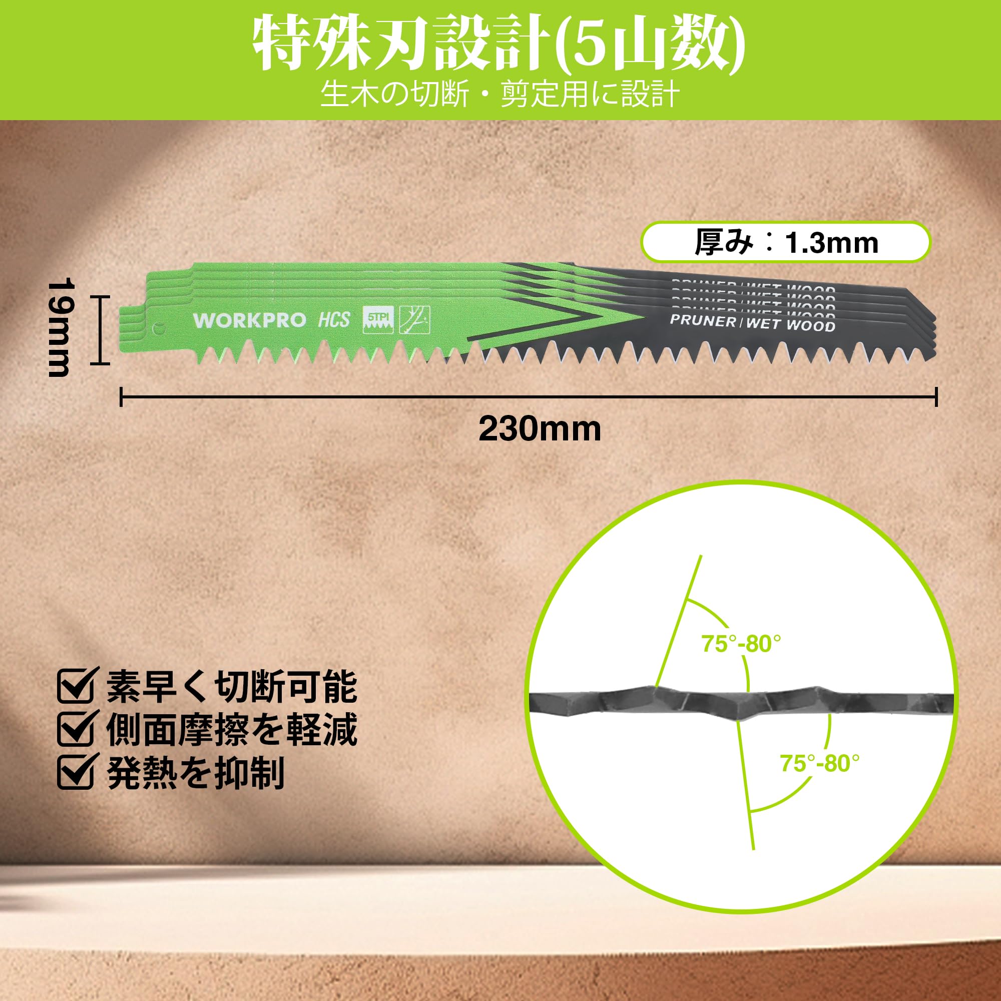 【在庫処分】【第二代 新登場】WORKPRO レシプロソー替刃 電気のこぎり替え刃 枝切り用 木工用 生木 枝打ち 果樹剪定 庭木剪定 230mm 5本組 緑
