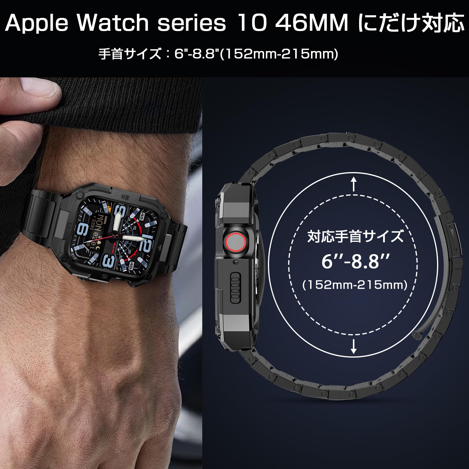 【対応機種&サイズ】このApple Watchステンレス一体型バンドはApple Watch Series 10 46mmに対応しています。手首サイズは15.2-21.5cmまで対応できます。(ご注意:手動測定のため、1-2㎜誤差はございます)