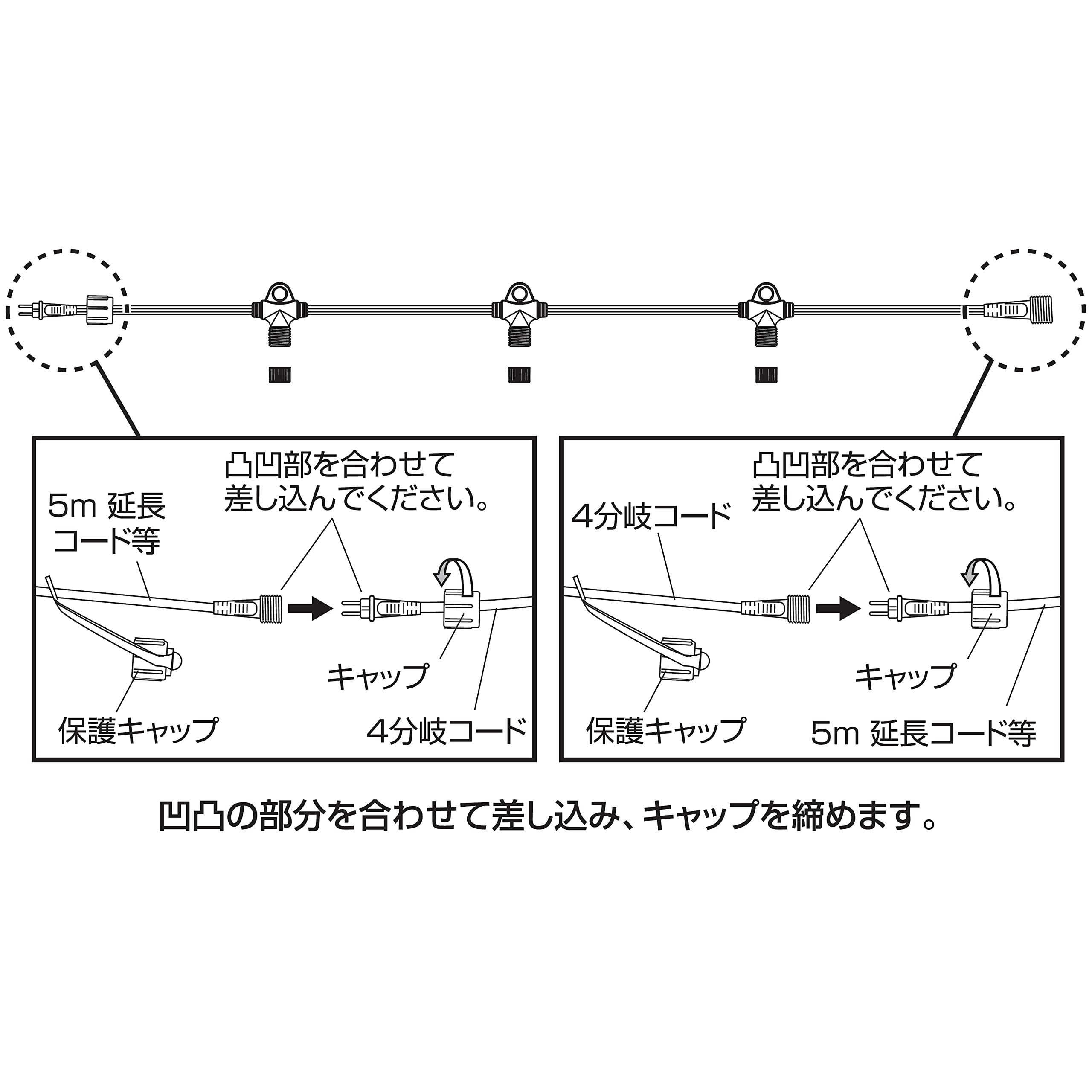 凹凸を合わせてプラグを差し込み、キャップを回すだけで接続完了。特別な技術、資格は不要。