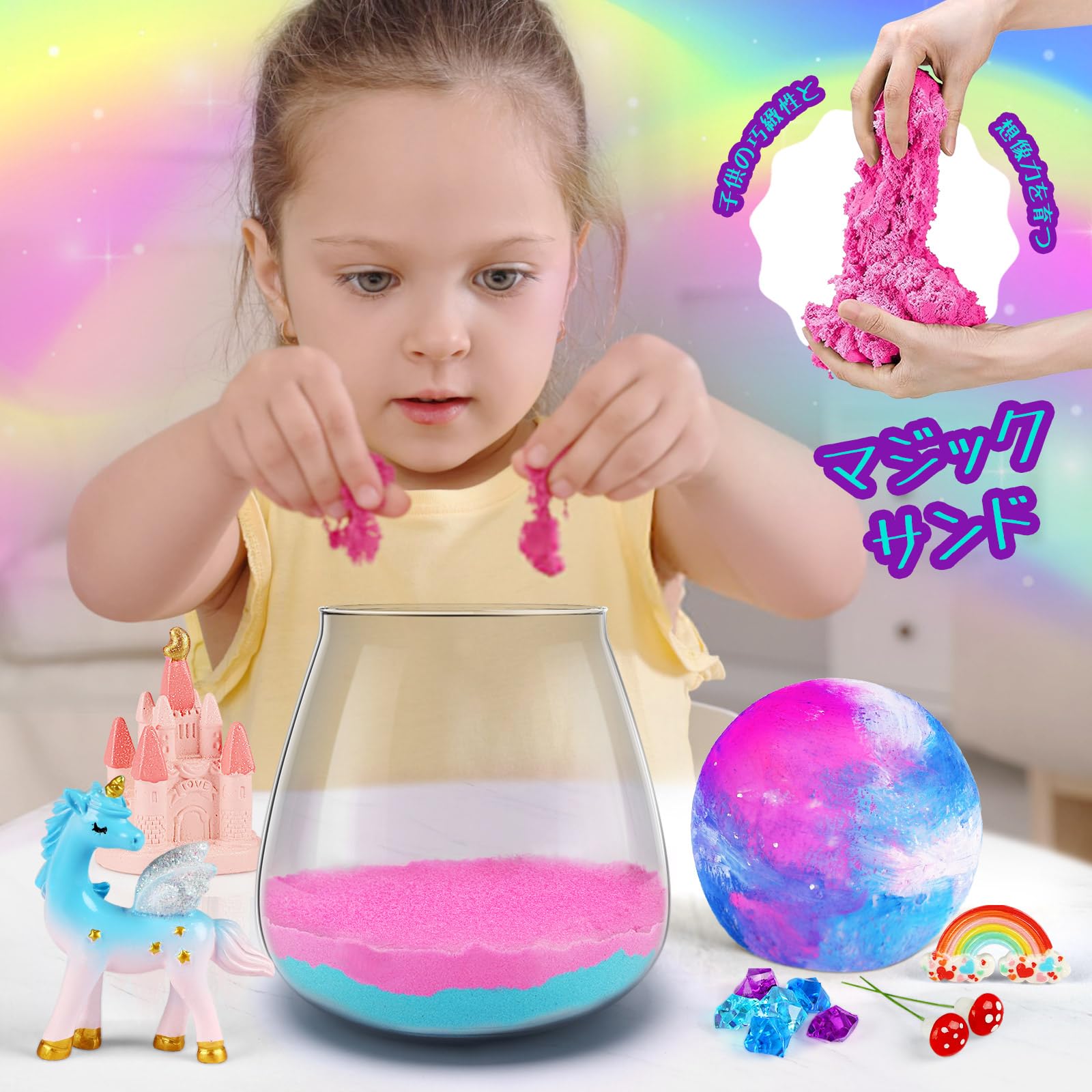 【自分だけのユニコーンテラリウムを作ろう】このユニコーンテーマのミニチュアキットは、子供たちを夢中の世界へといざないます。色とりどりのサンド、かわいいきのこ、幻想的なお城などのミニチュアパーツを使って、想像力を存分に発揮して自分だけのファンタジーな世界を自由に構築できます。
