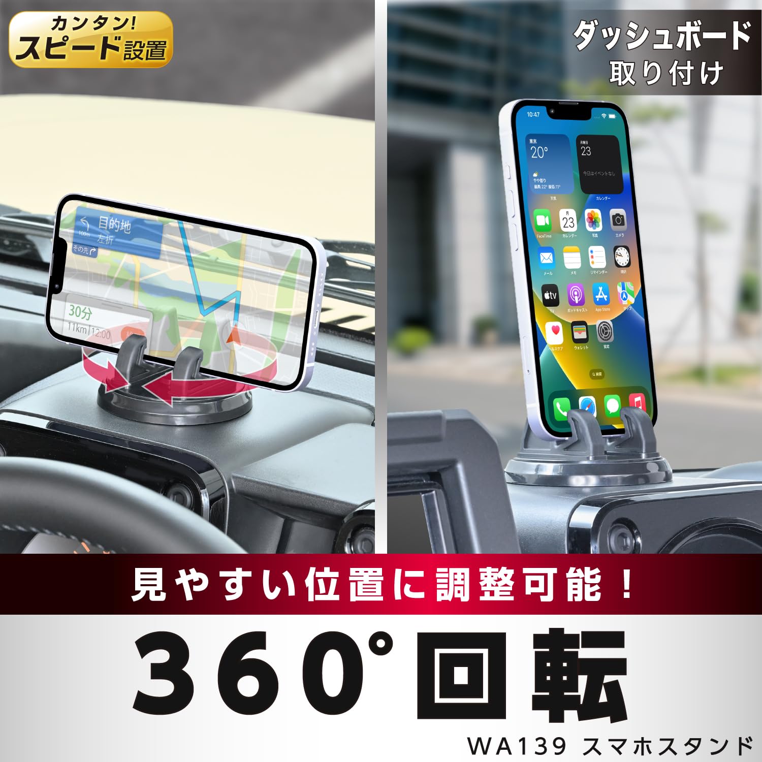 ●スタンド全体が360°回転するから、運転席からも助手席からも見やすくできます。