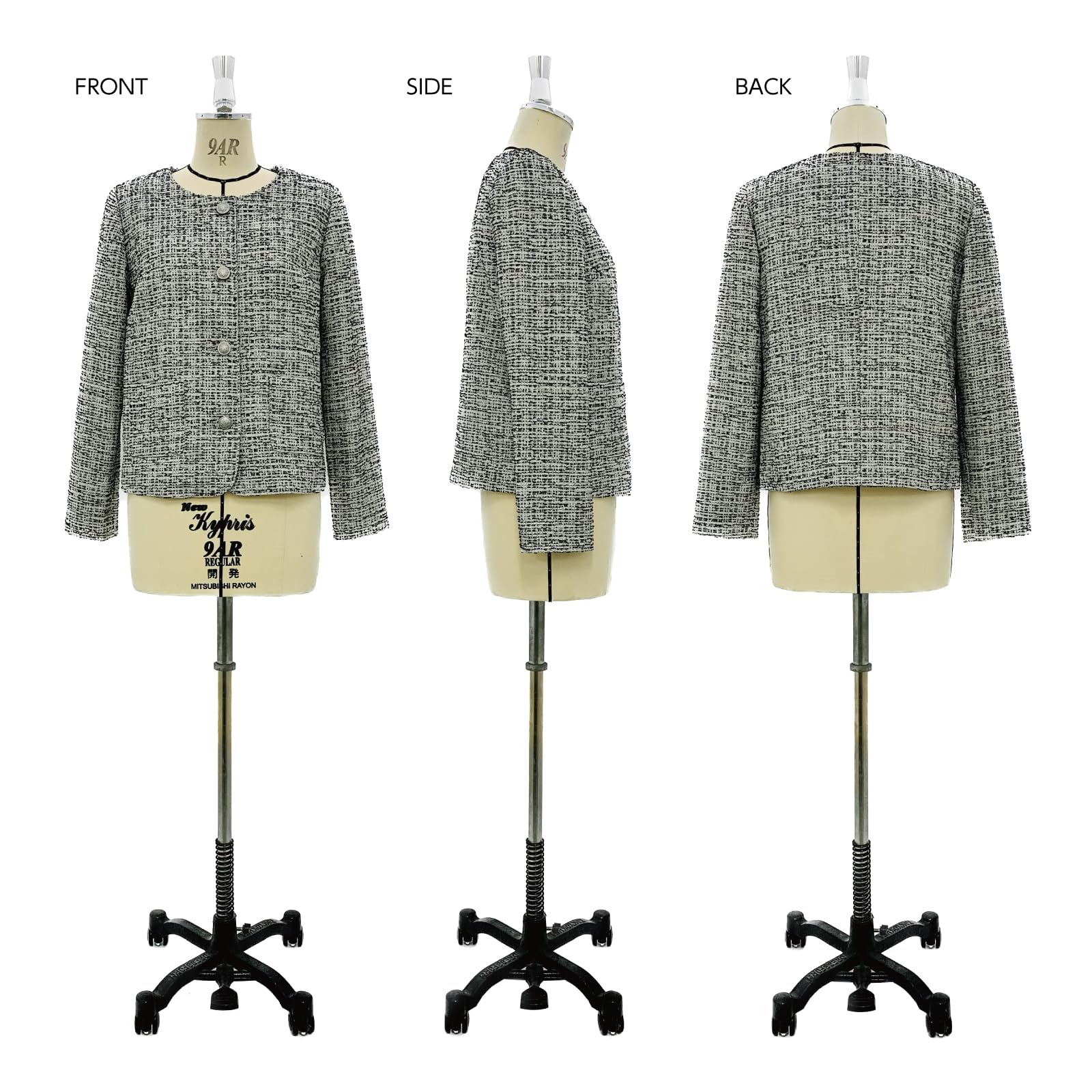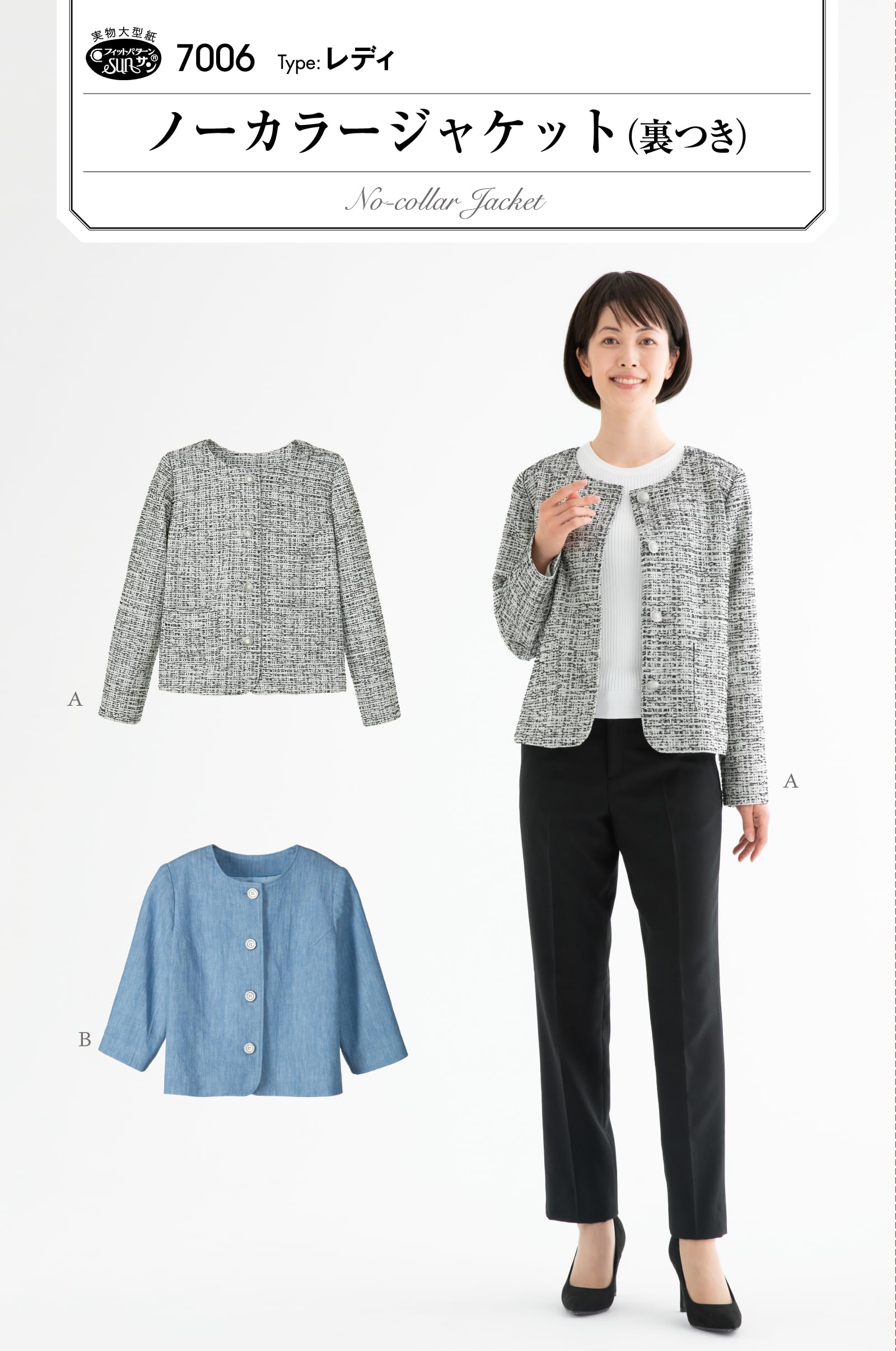 上品で女性らしいノーカラージャケット。 裏地のパターンつきで、Aは長袖・ポケットつき、Bは7分袖。