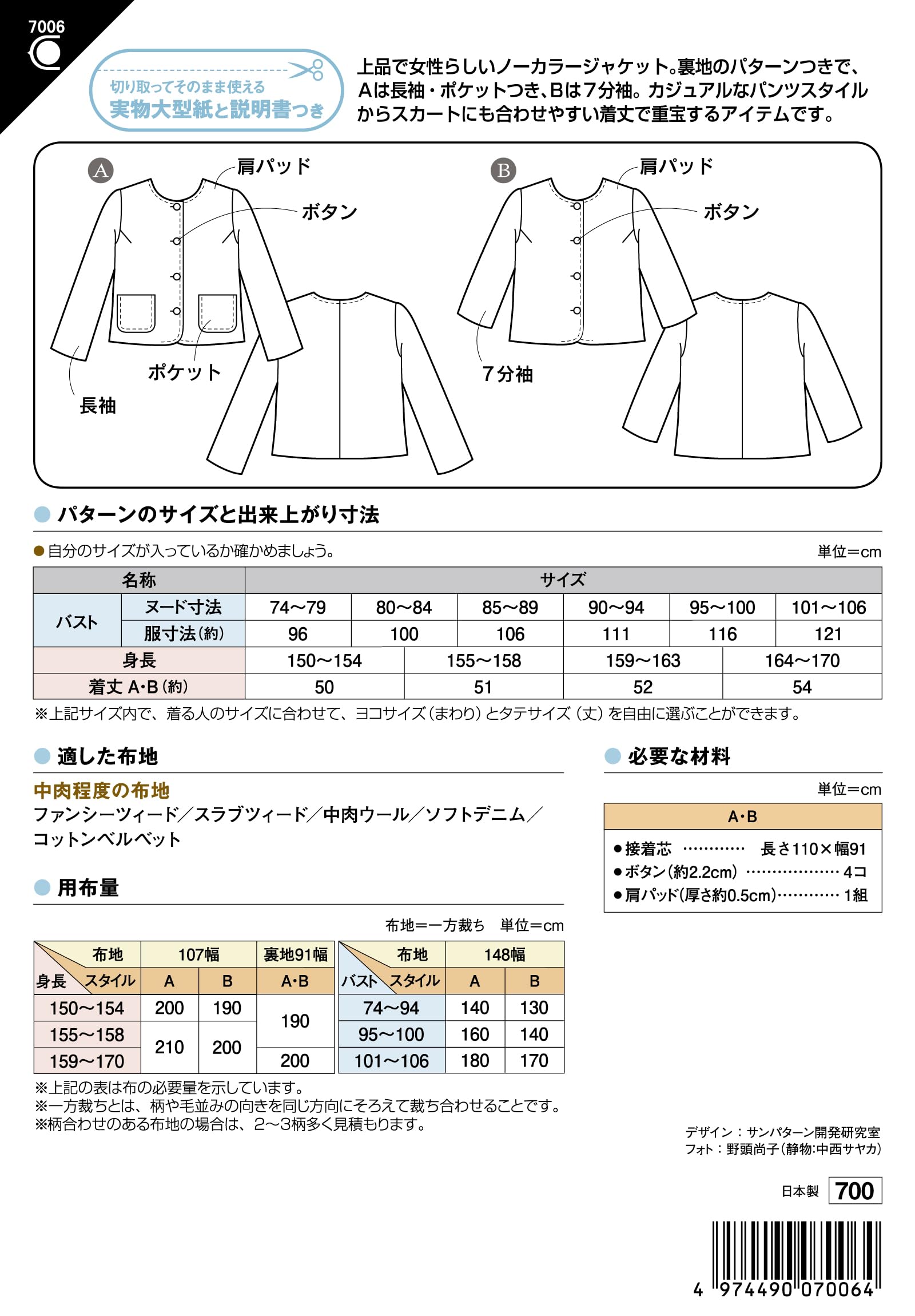 サン・プランニング 型紙 パターン ノーカラージャケット 7006