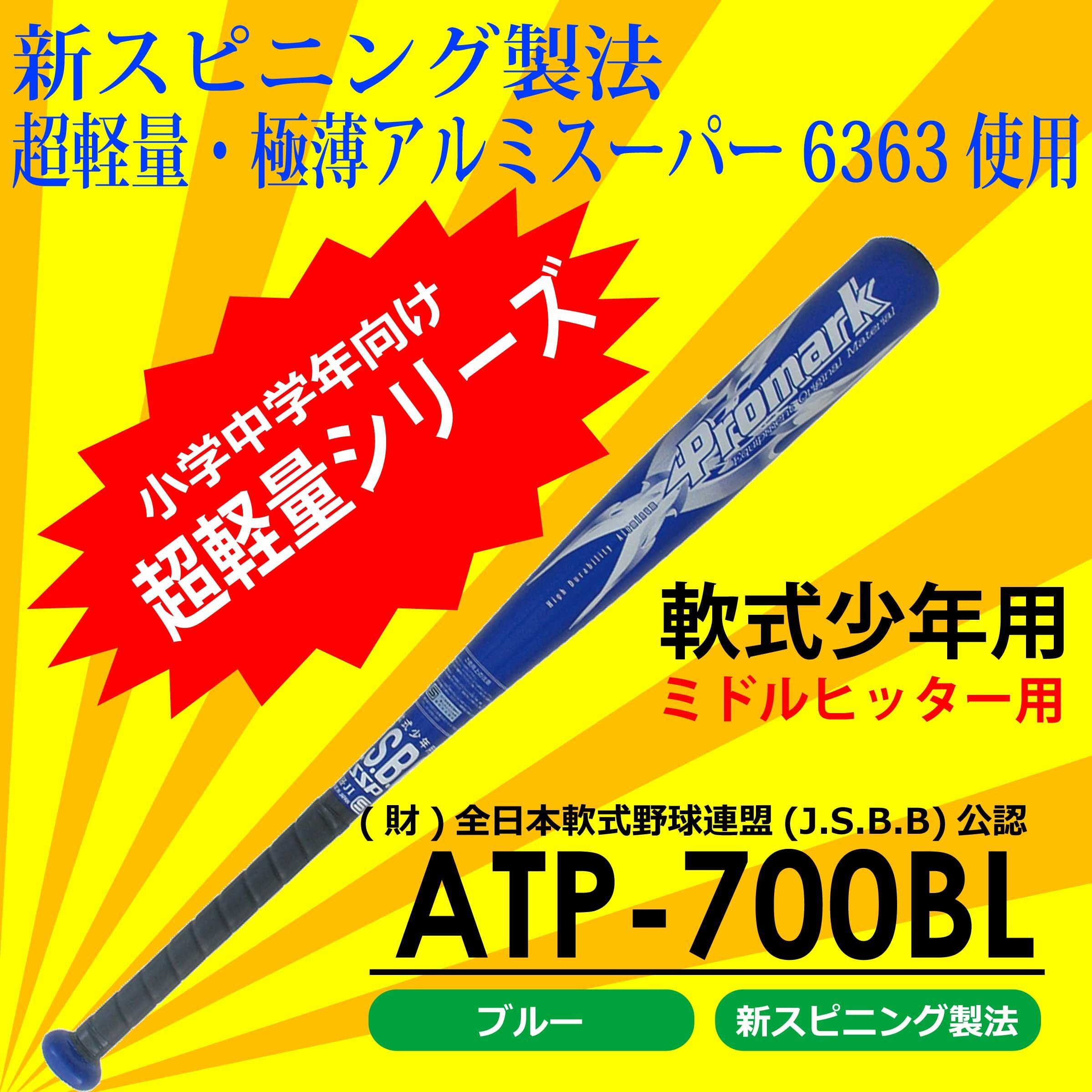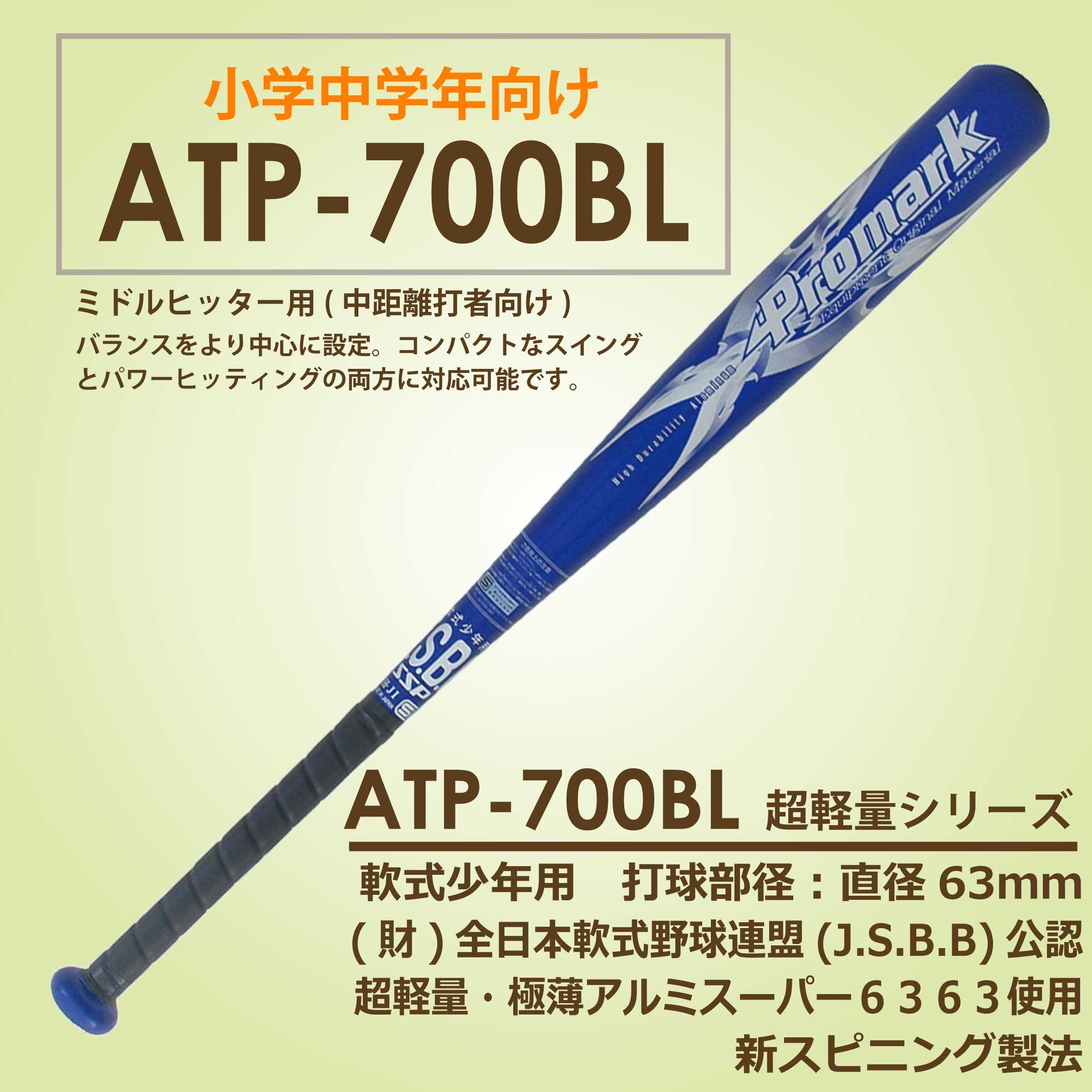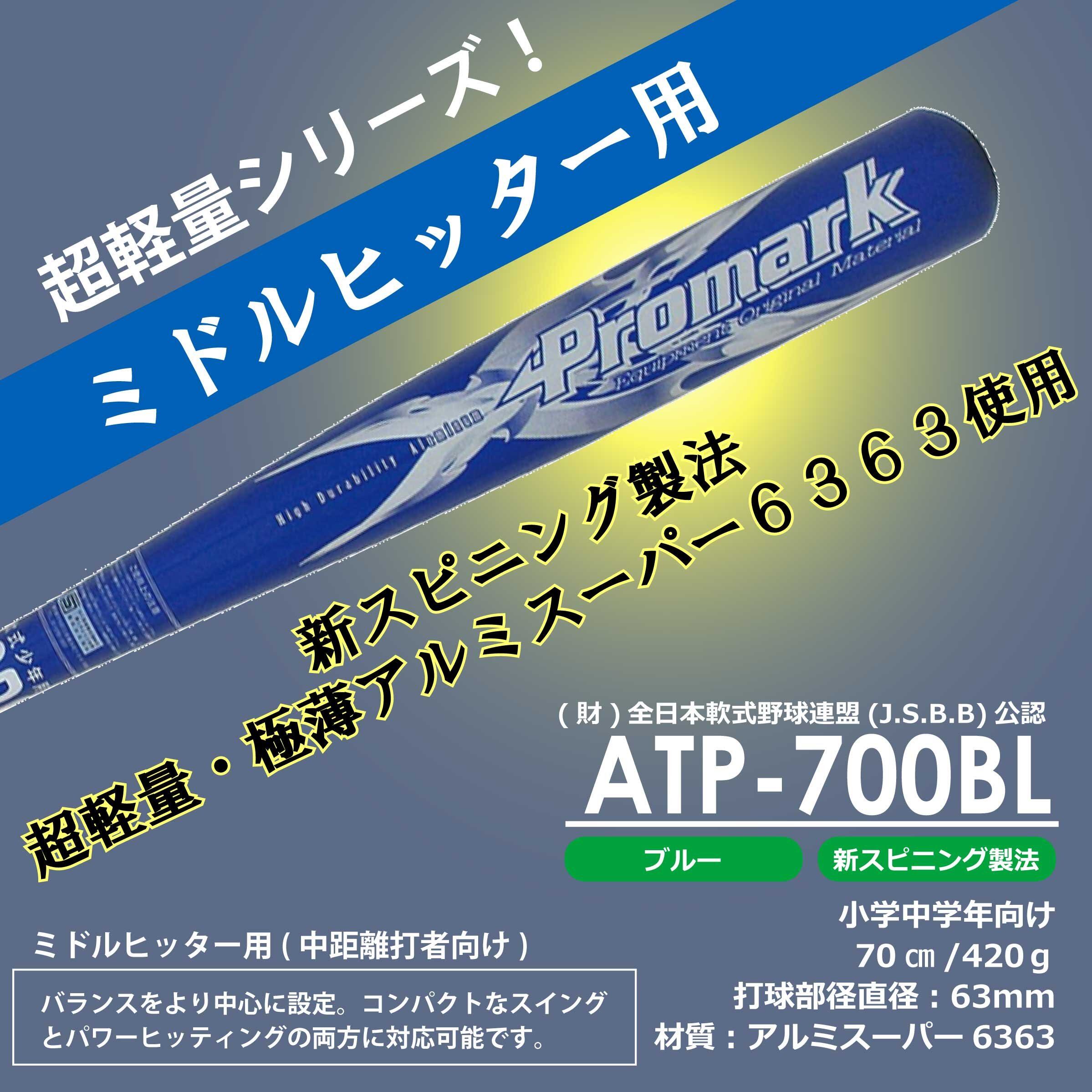 プロマーク 軟式一般用 アルミバット 70cm ATP-700 BL 材質:アルミ合金 長さ:70cm 重量:約400g 打球部径:63mmφ カラー:ブルー ミドルヒッター用 小学校低学年向け JSBB公認、軟式少年用【超軽量】金属バット
