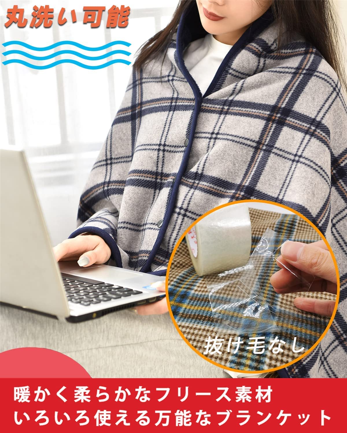 【デザイン】A面:発熱カシミヤ活性印花フリースを採用に対し、B面:は吸湿発熱抗菌消臭法のフランネルを採用する、ふんわりやわらかな肌触りが特徴の素材です。計4箇所にスナップボタンがついており、ポンチョとして羽織ったりスカートのように腰に巻いたりできます。収納時もかさばりにくいのがポイントです。