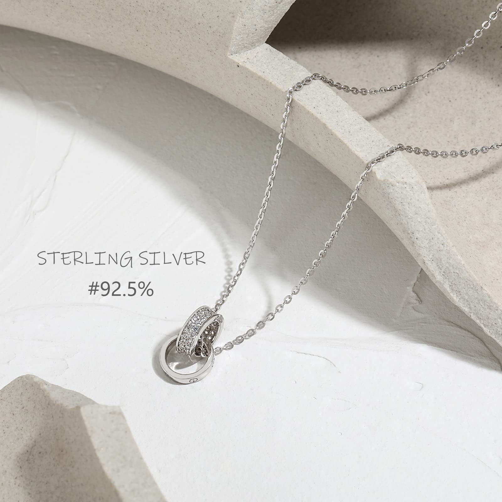 【エレガントで大人可愛いダブルリングネックレス】エレガントで大人可愛く、洗練されたデザインで数多くのお客様に愛されてきた、大人気のダブルリングネックレスです。片方のリングには最高級キュービックジルコニアが程よく嵌め込まれ、片方のリングにはポイントとなる丸が刻印されています。アンバランスのデザインはトレンド感たっぷりでデコルテを華やかにしてくれます。ペンダントの大きさは約8.5mmと華奢で、女性のデリケートさと美しさを際立たせます。チェーンは世界中で最も親しまれているアズキチェーンを採用し、長さは40+5cm(長さ調整可能)となっており、コーデによって長さを調整でき、使い勝手が抜群です。地金は体に優しく幸運を運んでくれるスターリングシルバー925を使用し、高級ジュエリーによく採用される純ロジウムコーティング(プラチナ仕上げ)が熟練の職人たちの手によって丁寧に施されています。エレガントで大人可愛いピンクゴールドと、ゴージャスで肌映えの良いゴールド、そしてスタイリッシュで上品なプラチナの3色がラインナップされています。本物ならではの上品な輝きはさり気なく首元を彩ってくれます♪