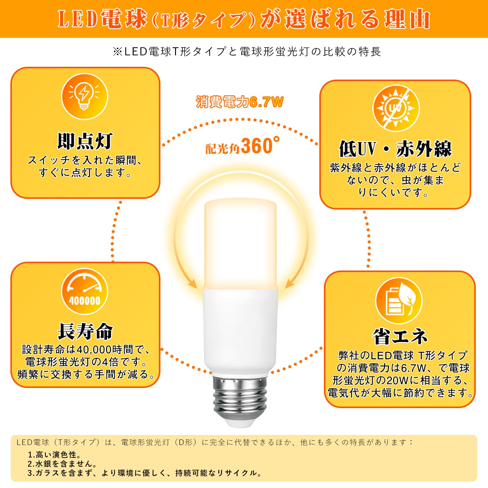 ?【即点灯、長寿命、省エネ】電球形蛍光ランプに比べ、LED電球は点灯が早く、寿命が長く、省エネにもなります。