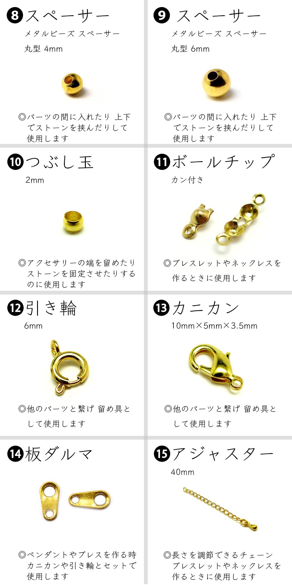 『10個 メタルビーズ スペーサー 丸型 6mm 』『100個セット つぶし玉 2mm』 『100個 ボールチップ カン付き』 『10個 引き輪 6mm』 『10個 カニカン 10mm×5mm×3.5mm』 『10個 板ダルマ』